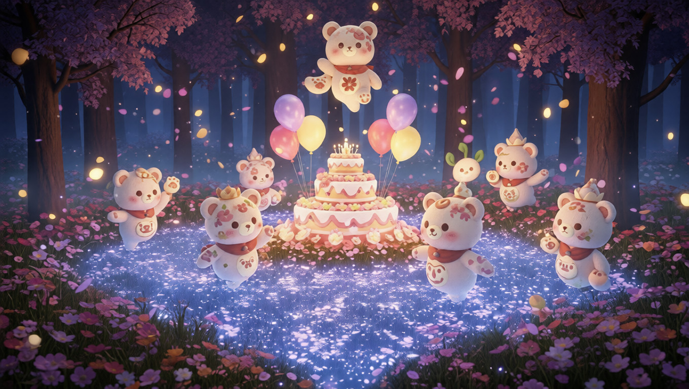 This illustration introduces an original fantasy concept centered around lucky bear humanoid spirits, designed in a 3D chibi style and placed within a glowing flower sea hidden deep inside a phantom forest. The artwork focuses on a joyful birthday celebration, combining soft forest lighting, blooming floral elements, and expressive character…