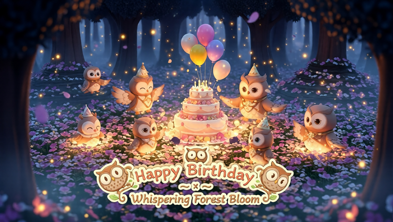 This fantasy illustration introduces a fully original concept centered on lucky owl humanoid spirits, designed in a 3D chibi style and set within a glowing flower sea hidden deep inside a phantom forest. The artwork captures a birthday celebration that feels intimate, warm, and quietly magical, blending forest atmosphere with…