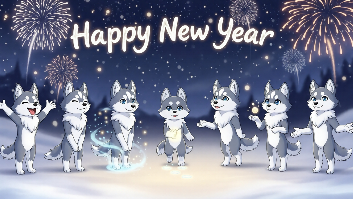 A light fantasy anime–style New Year banner featuring seven dream-born humanoid husky spirits—gentle, magical, and perfect for winter celebration photo moments. The Dream Husky Spirits New Year Banner is an original light fantasy anime–style illustration created for winter celebrations and New Year photo backdrops. Inspired by mythical husky spirits born…