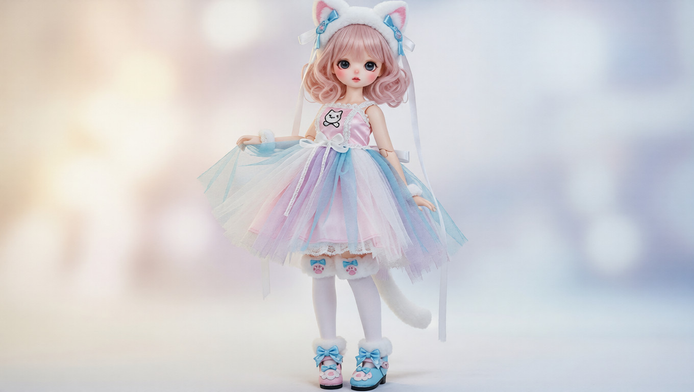 Snowwhisker Tulle Doll Outfit | Cute Sheer Cat Dress with White Stockings for 3D Q Dolls