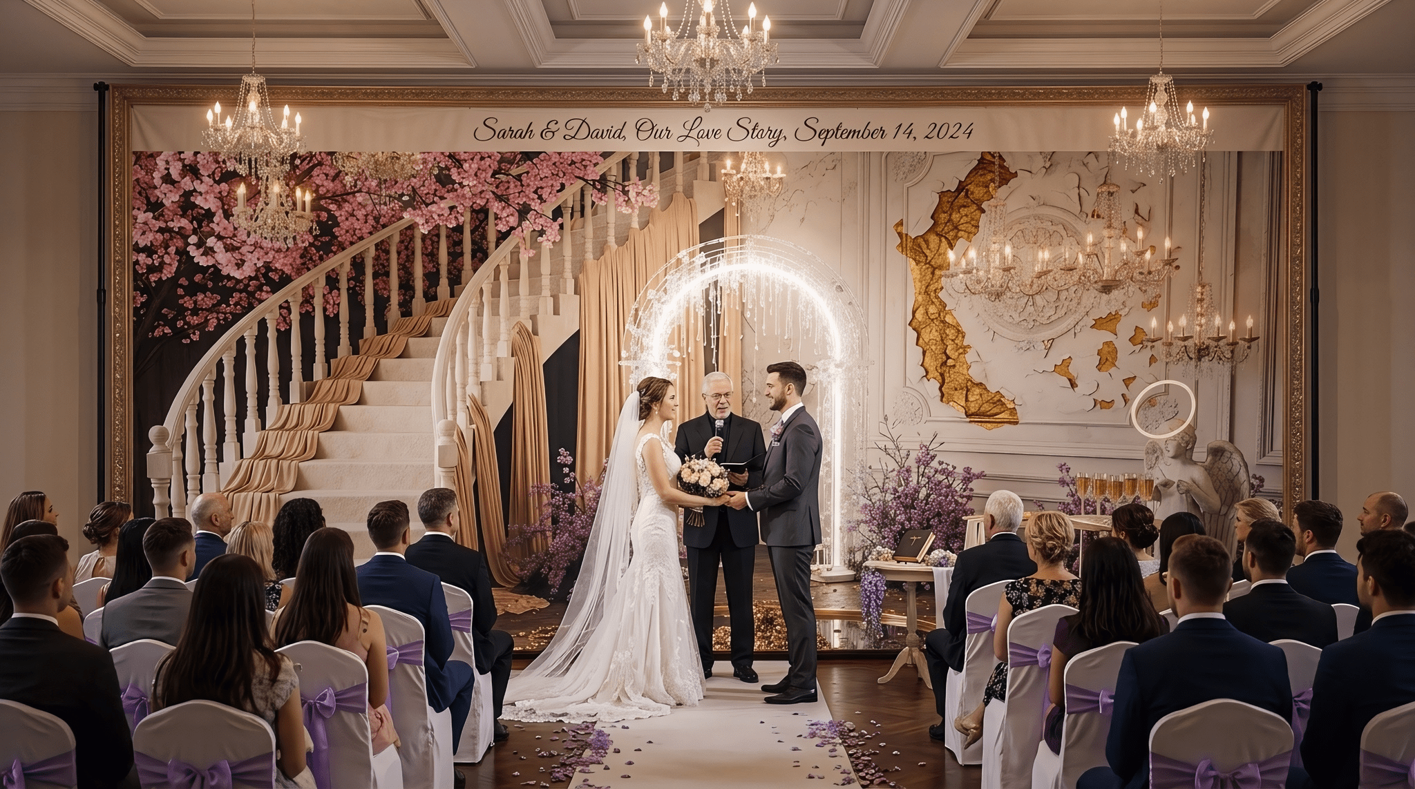 Enchanted Chateau Elegance: Frayed Velvet Stairs, Smudged Crystal Arch, and the Unpolished Luxury of a Fantasy Wedding Backdrop