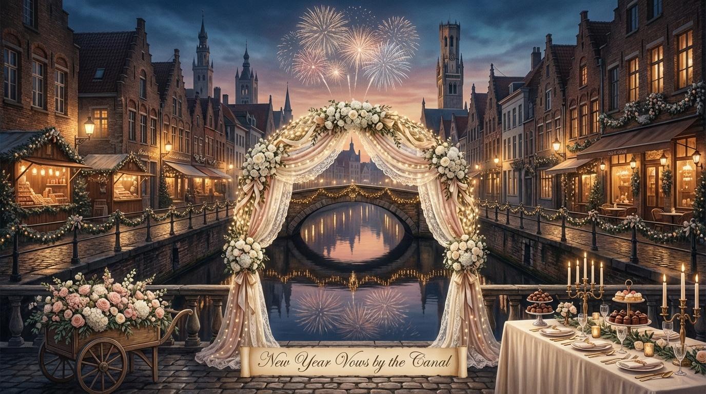 Custom Bruges canal New Year wedding backdrop, handcrafted with matte fabric, lace arch, and soft floral details. Perfect for photography, this handmade backdrop captures warm lights, canal reflections, and European charm, offering a unique and romantic setting for your wedding celebration.