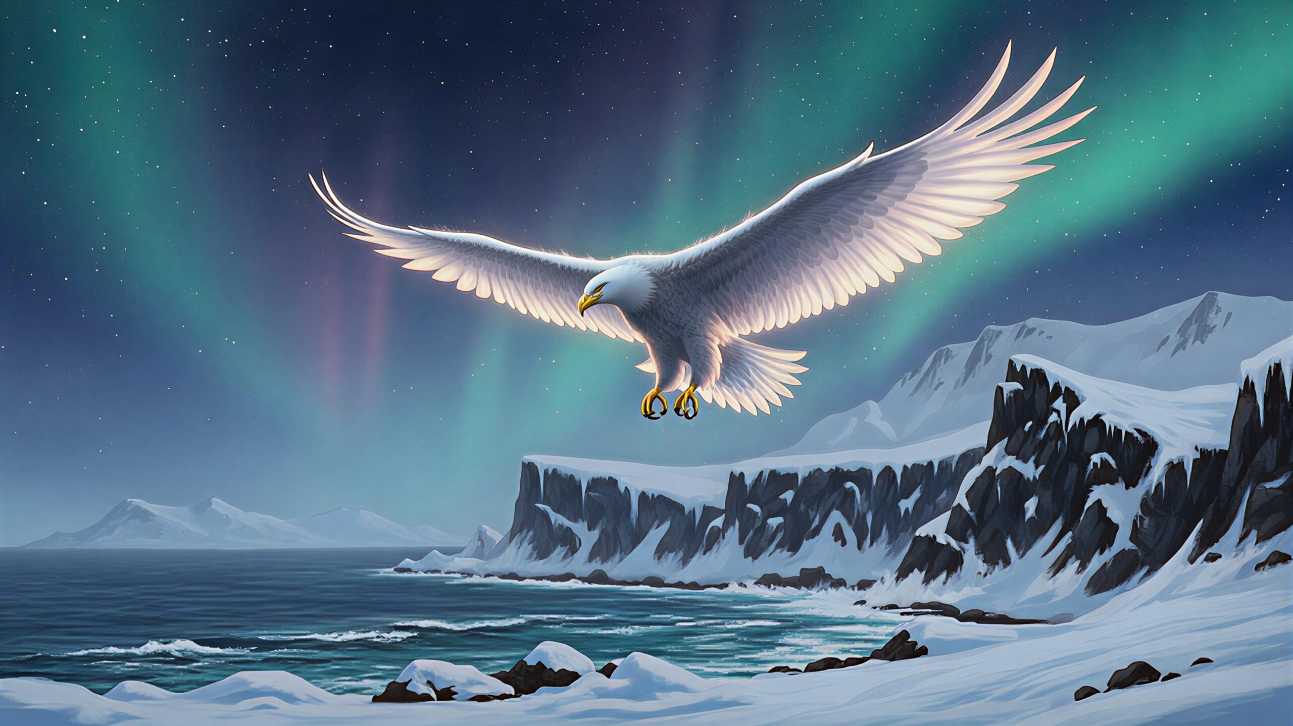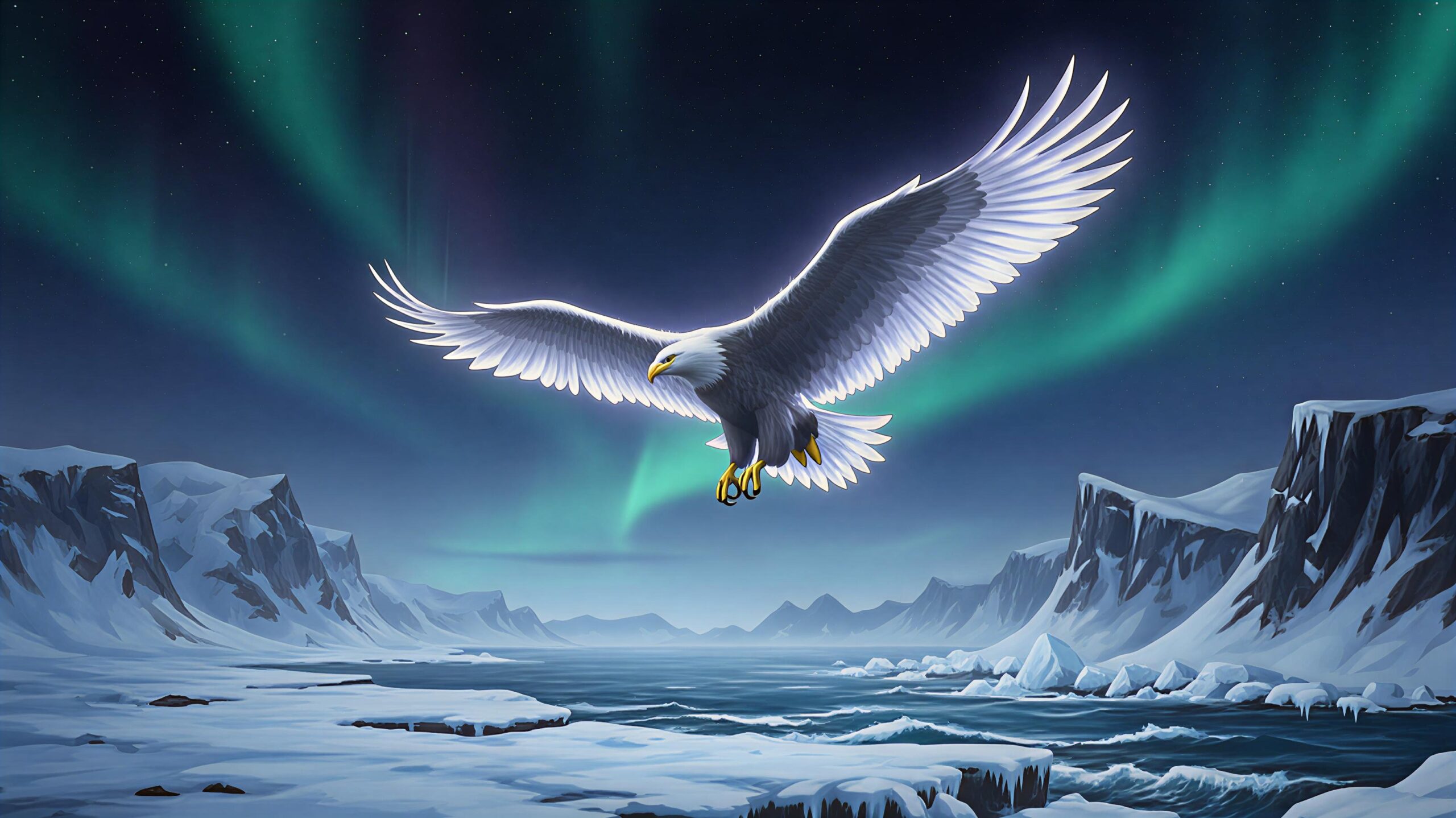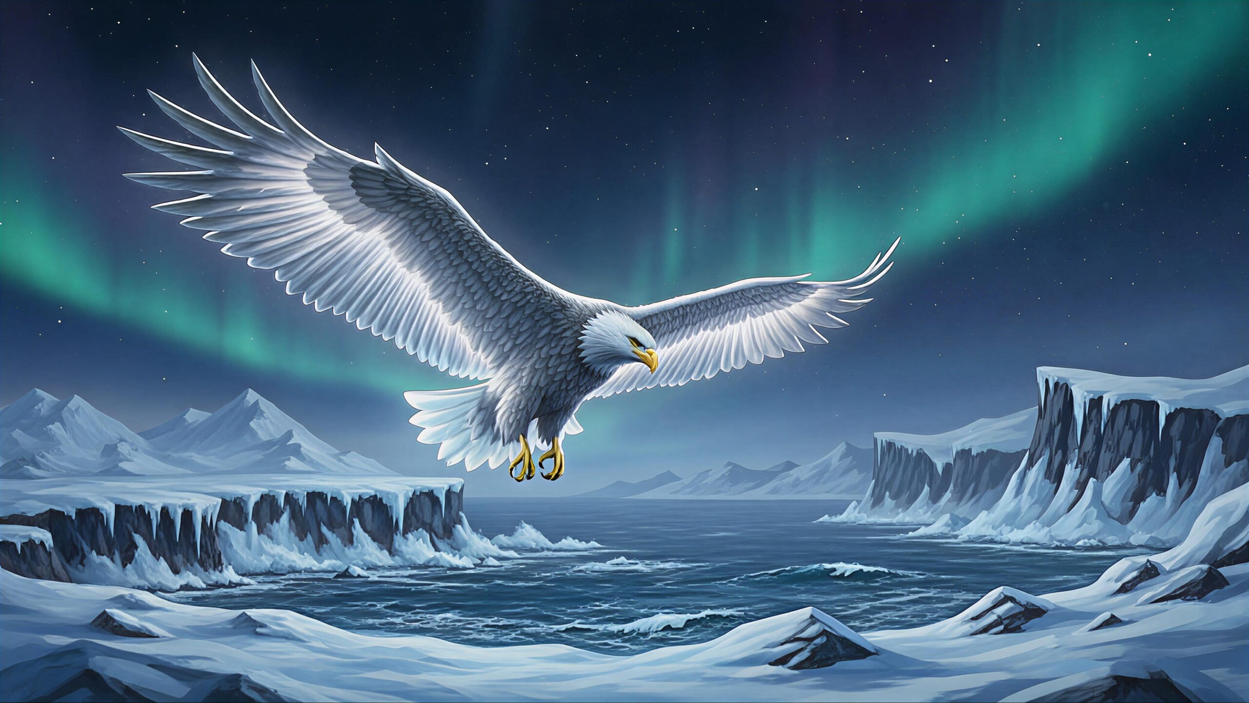 A breathtaking Arctic-inspired art piece featuring a luminous spirit eagle soaring above a polar coastline.
