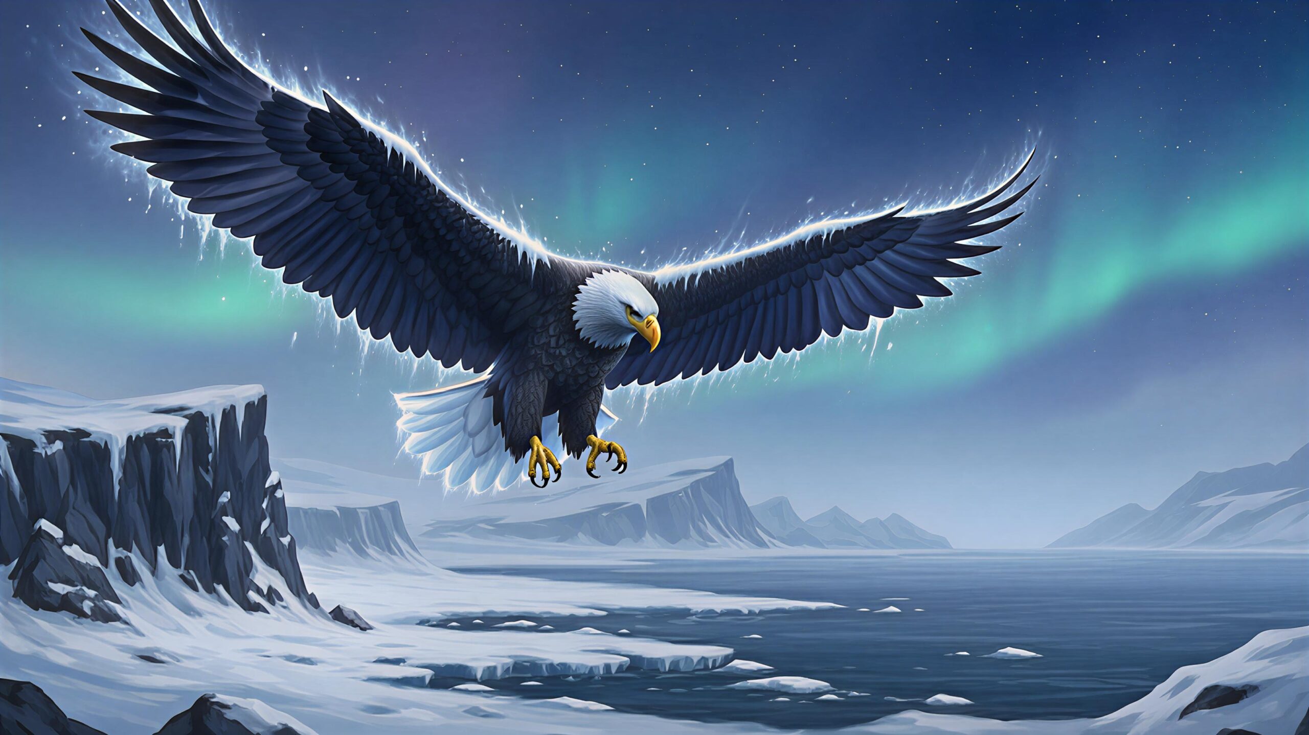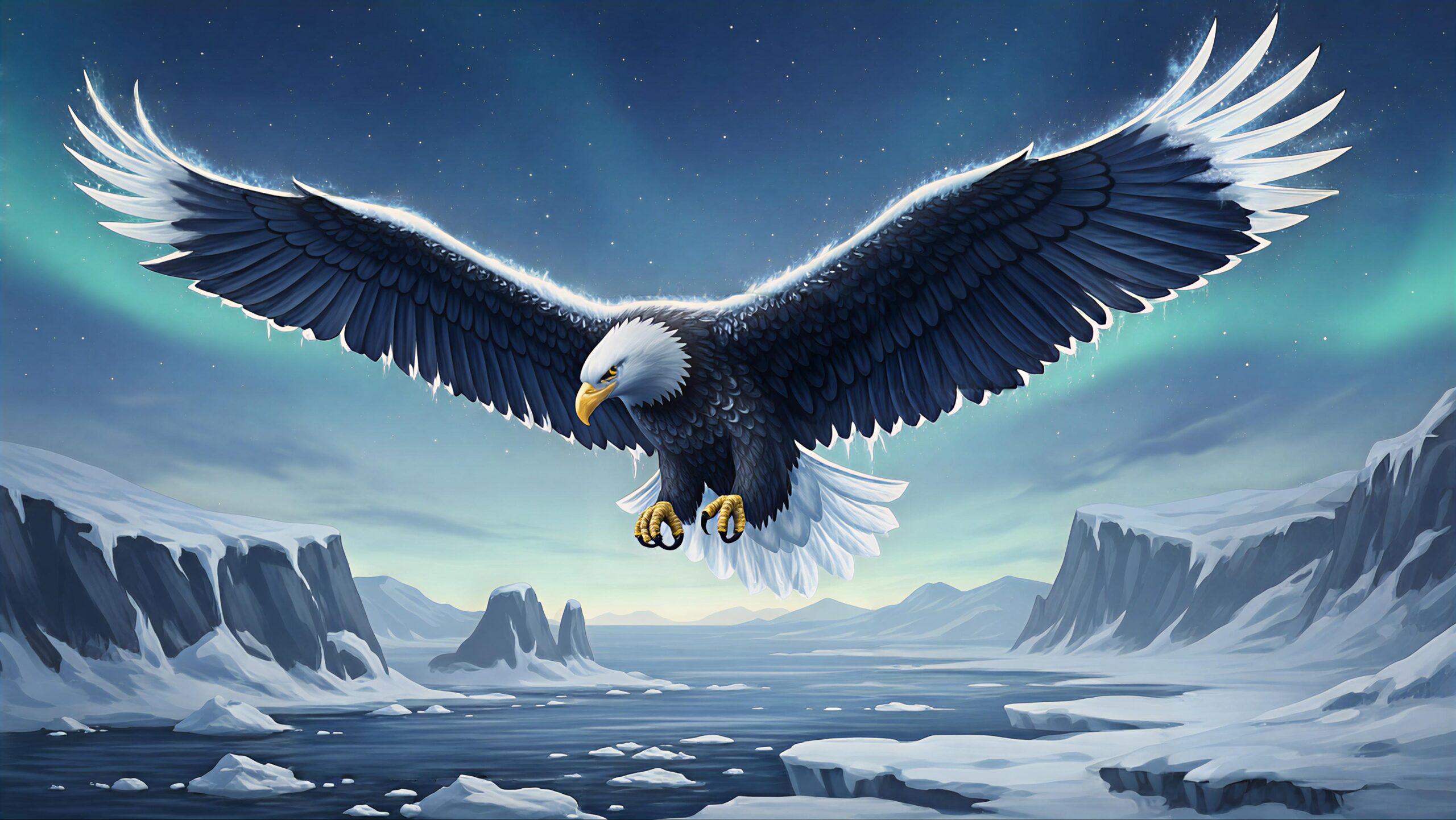 A stunning Arctic-inspired wall art piece featuring a luminous spirit eagle soaring over a polar coastline.