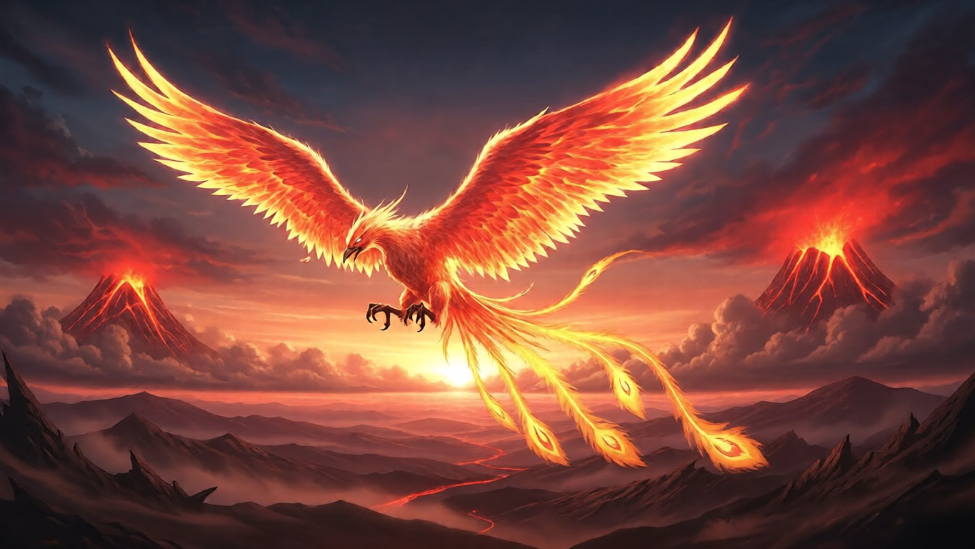 • Anime-style mythic phoenix rendered with glowing, high-impact lighting