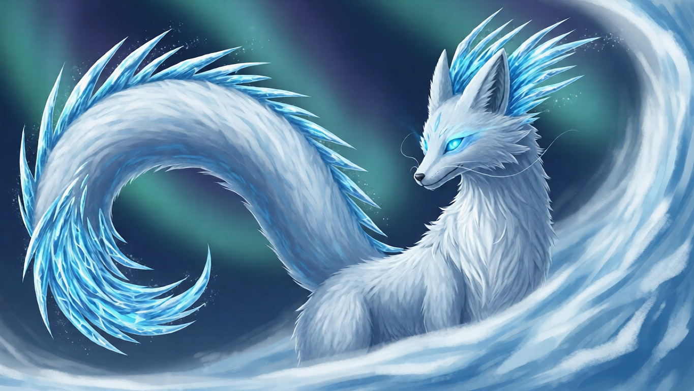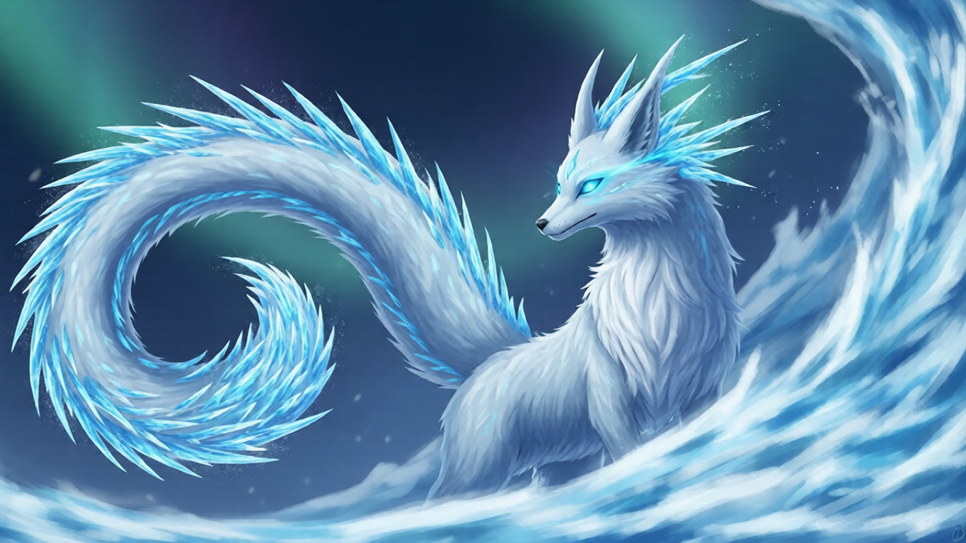Its long, dragonlike tail trails crystalline frost. Its fox-shaped eyes glow with pale blue fire. Wherever it steps, snowflakes rise and spiral like whispered prophecies.