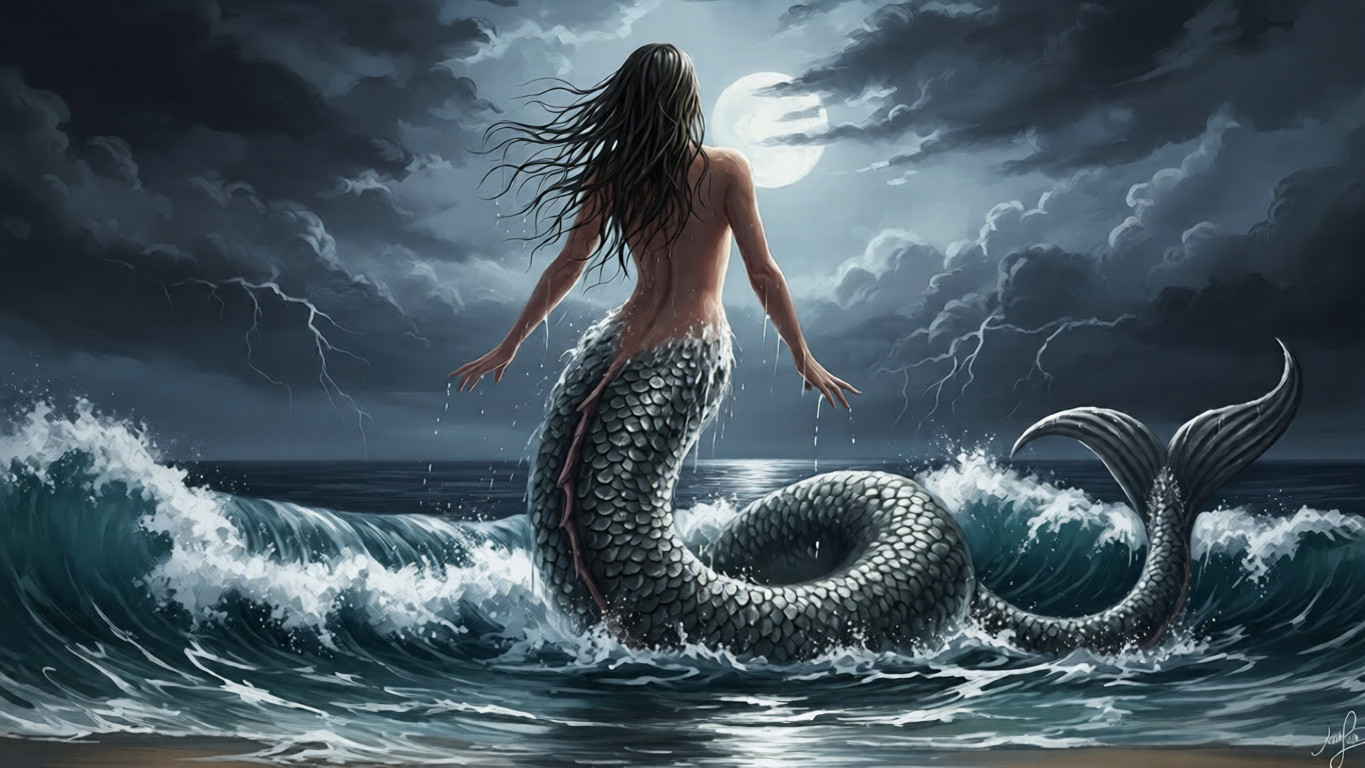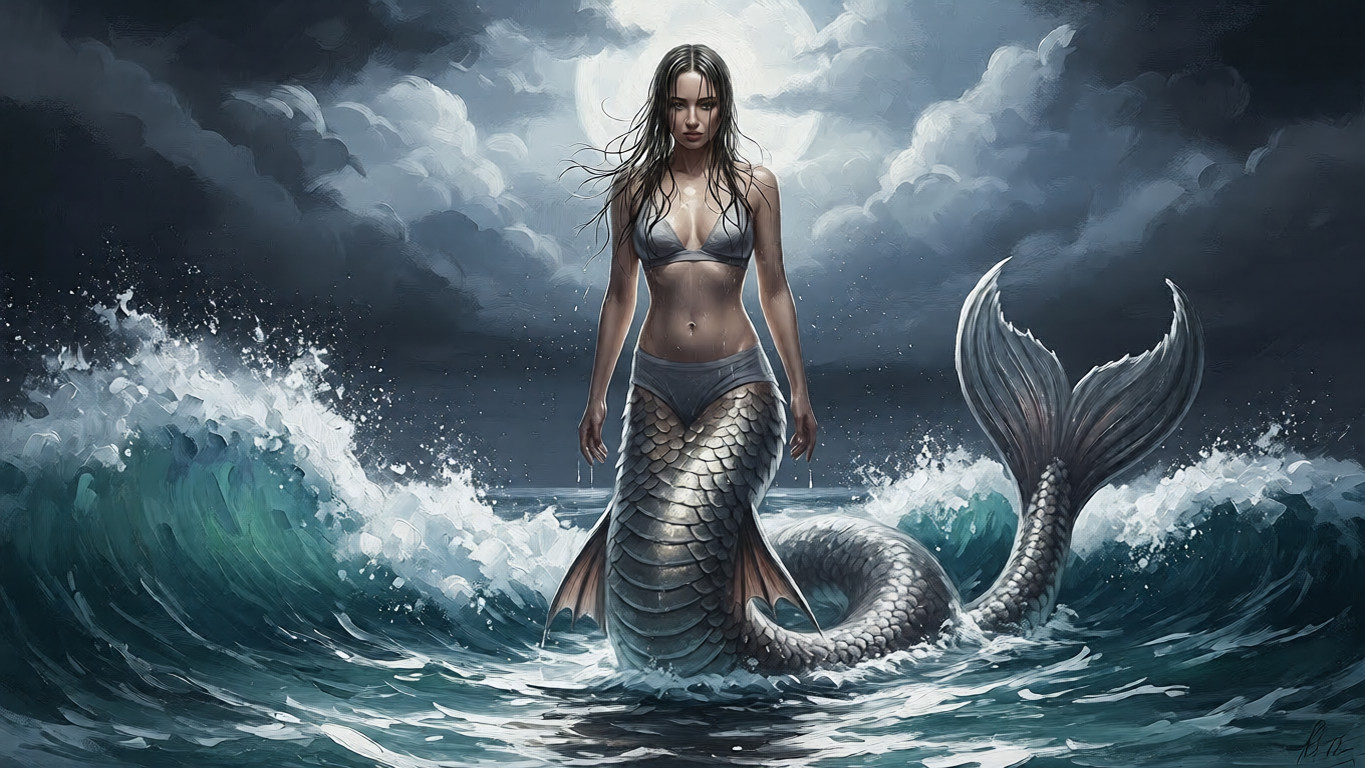 Neither demon nor goddess, she is the spirit of forgotten tides—her upper form humanlike, her lower body a serpent of shimmering wet scales. Her long black hair clings to her shoulders like strands of night-drenched kelp, and her eyes reflect moonlit water as though holding centuries of untold stories.