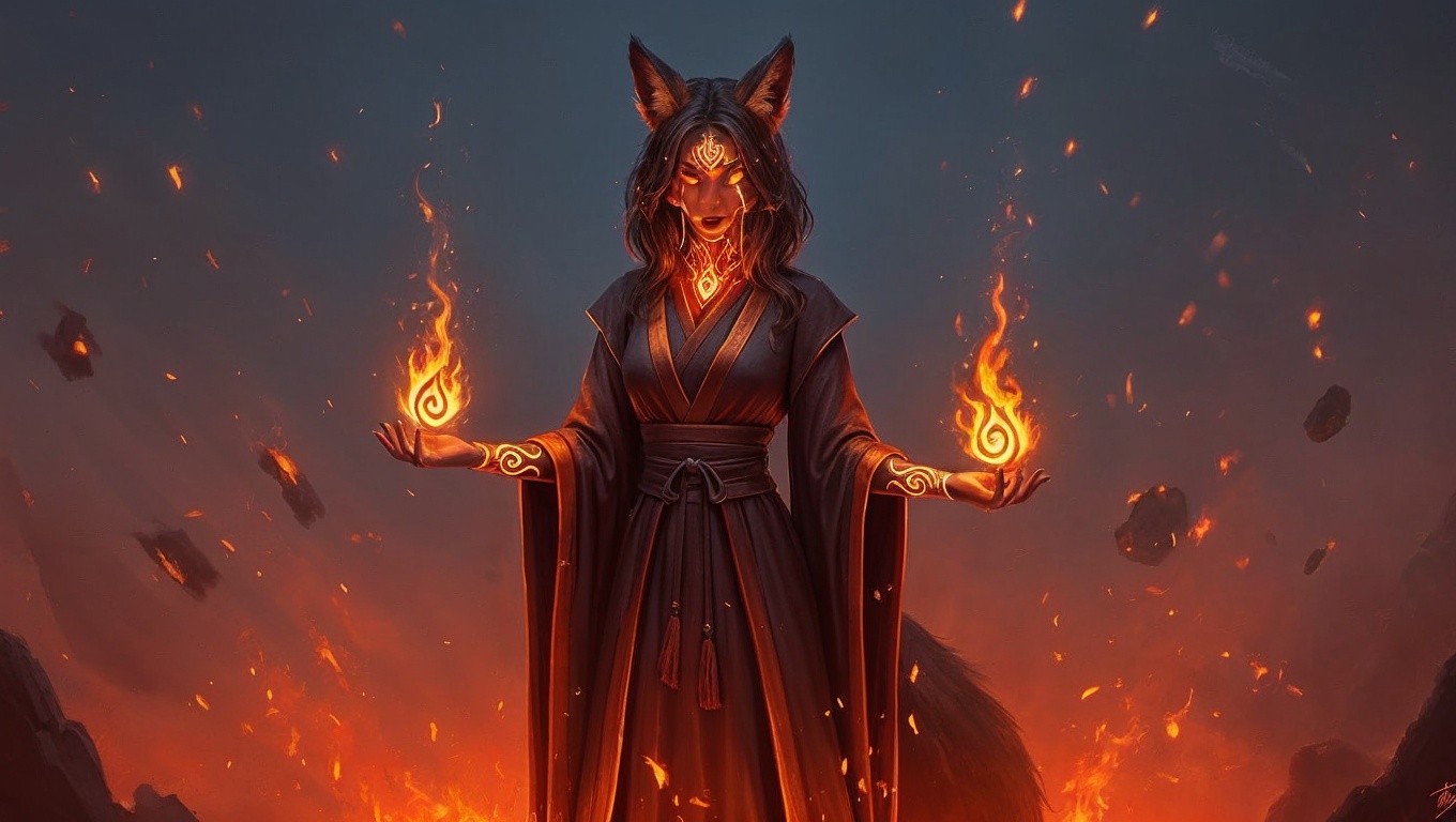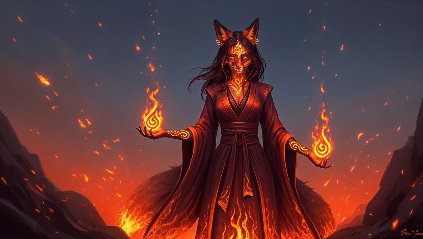 • Human-form fox spirit with elegant flame-sigil design