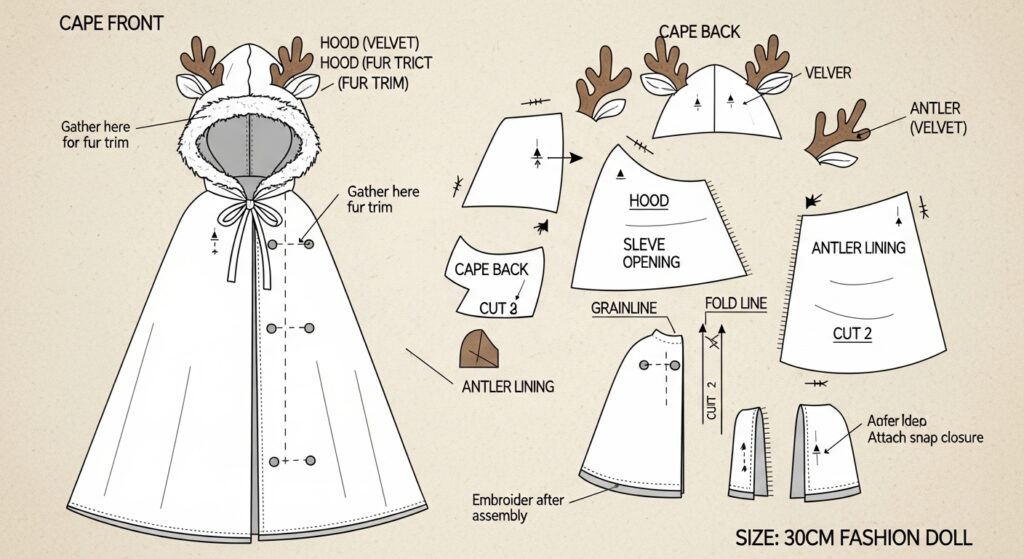 Wrap your doll in luxury this holiday season! This handmade red velvet cape coat is designed for 30cm female dolls, blending festive reindeer charm with elegant tailoring. The hood features soft plush antlers, while the white faux-fur trim and gold embroidery add a magical Christmas glow.