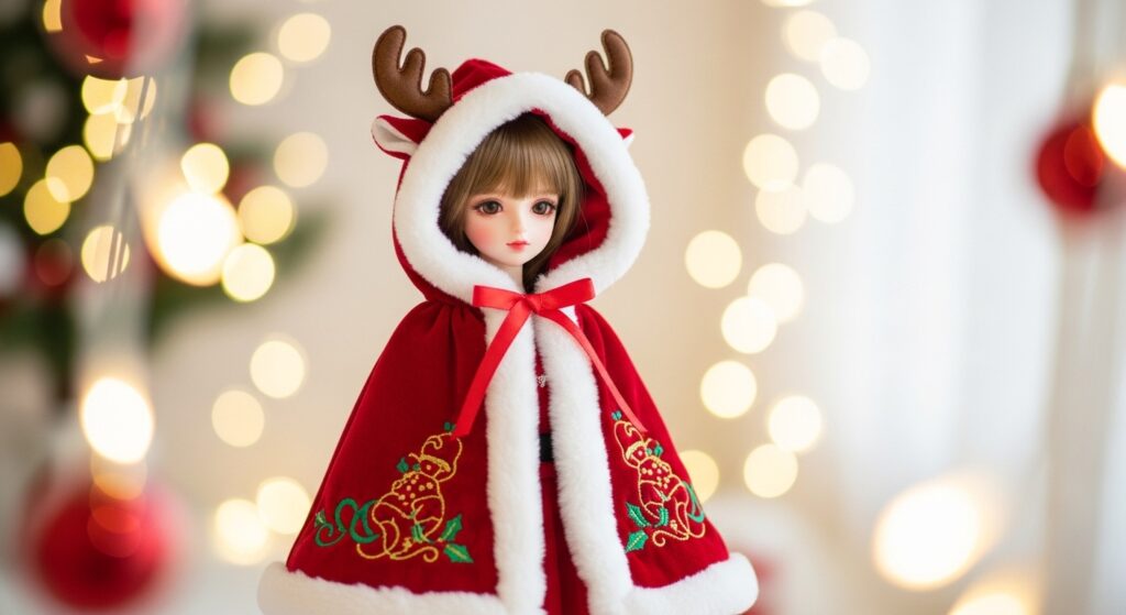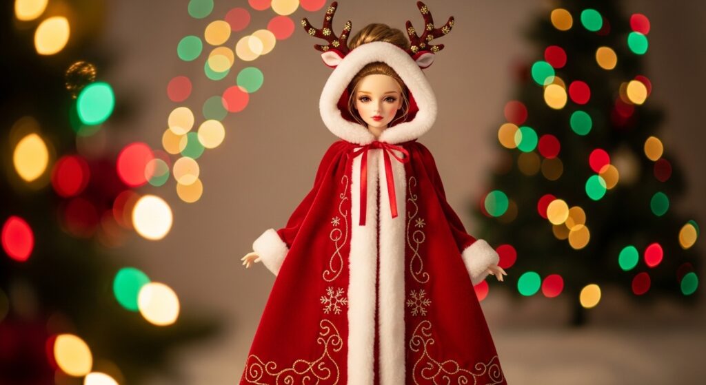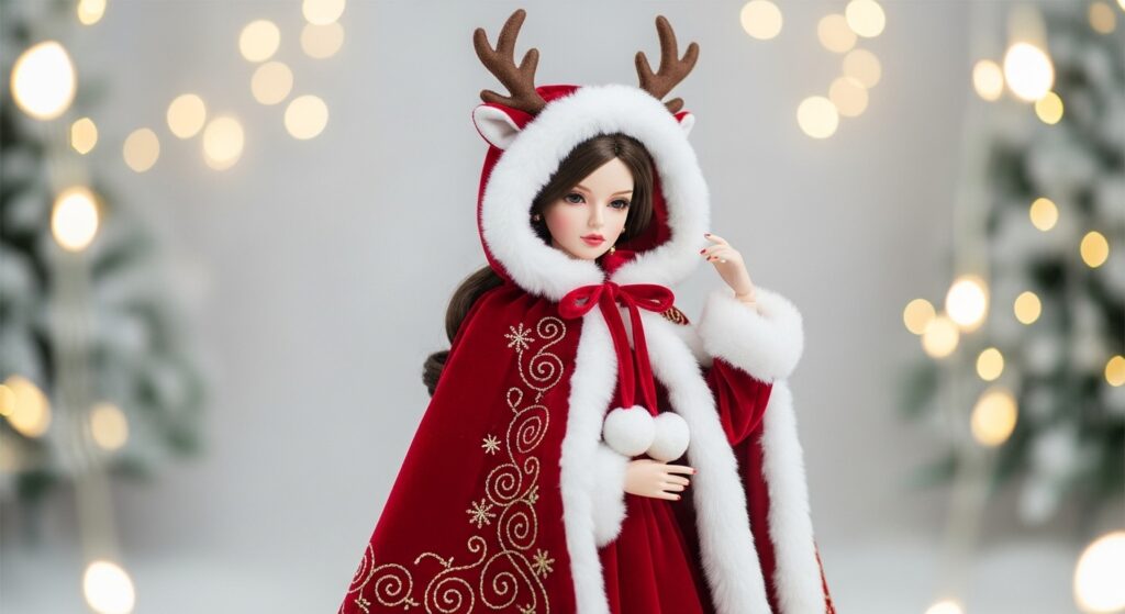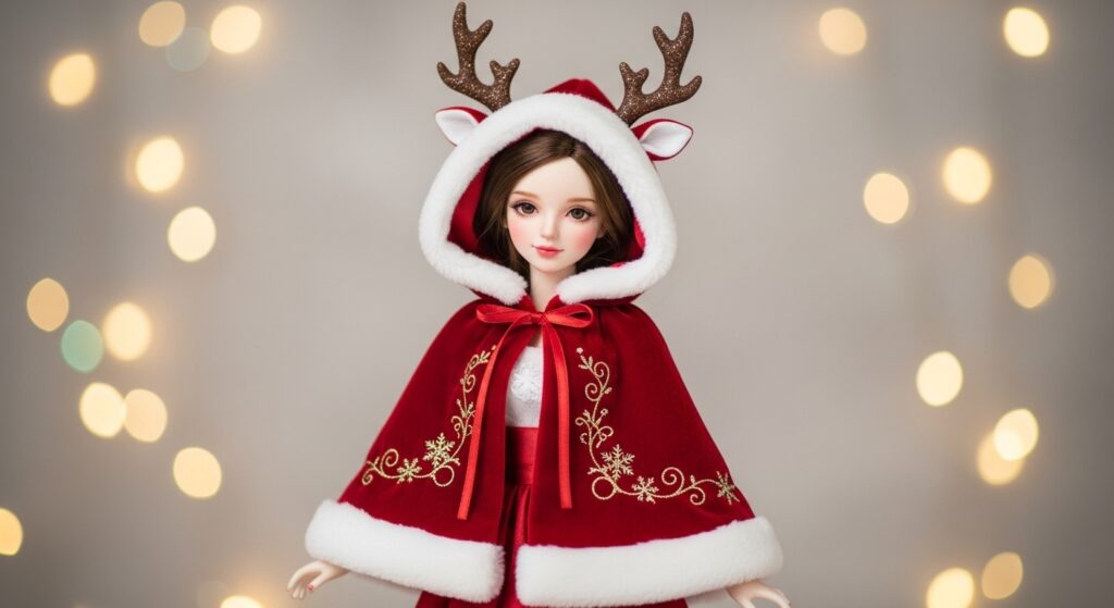 This reindeer cape combines craftsmanship, elegance, and Christmas spirit. It’s a tiny couture coat that gives your doll a festive fairytale style — warm, magical, and full of holiday sparkle!