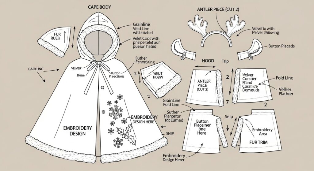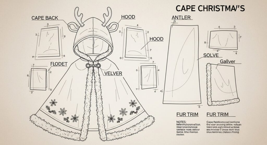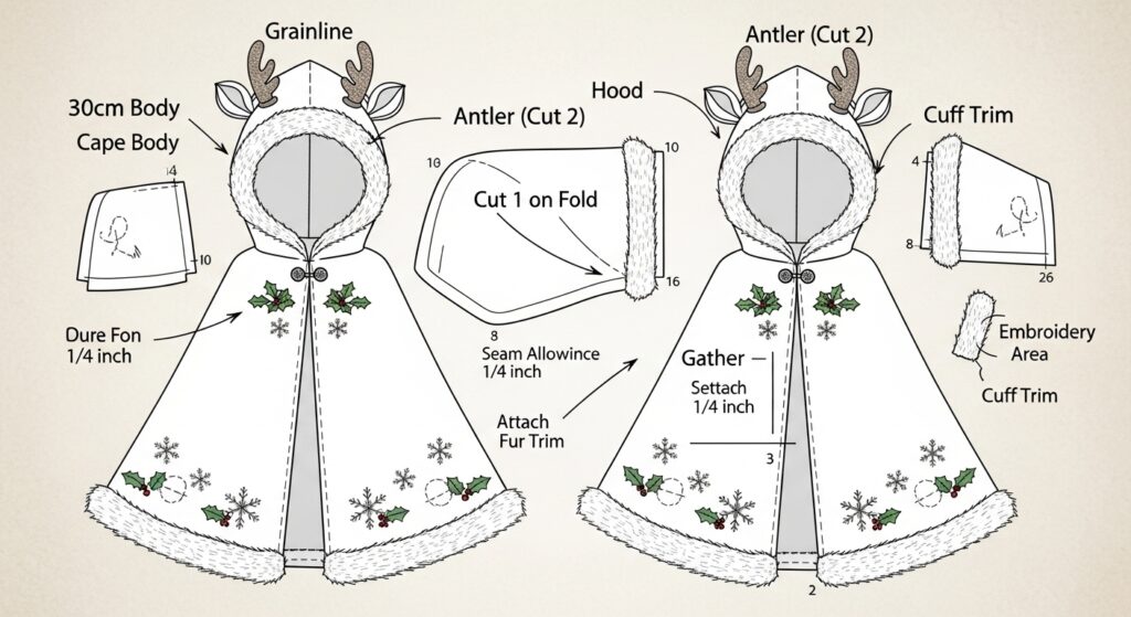 • 🦌 Festive design: reindeer antler hood with gold-stitched snowflakes.