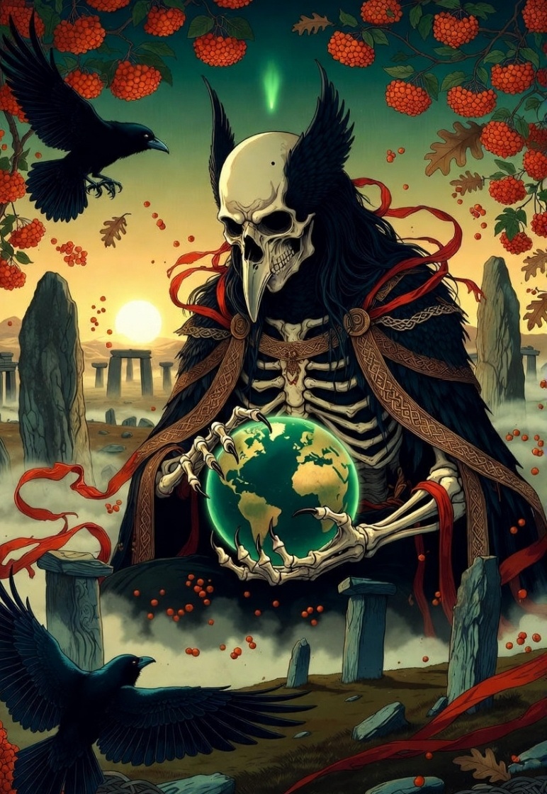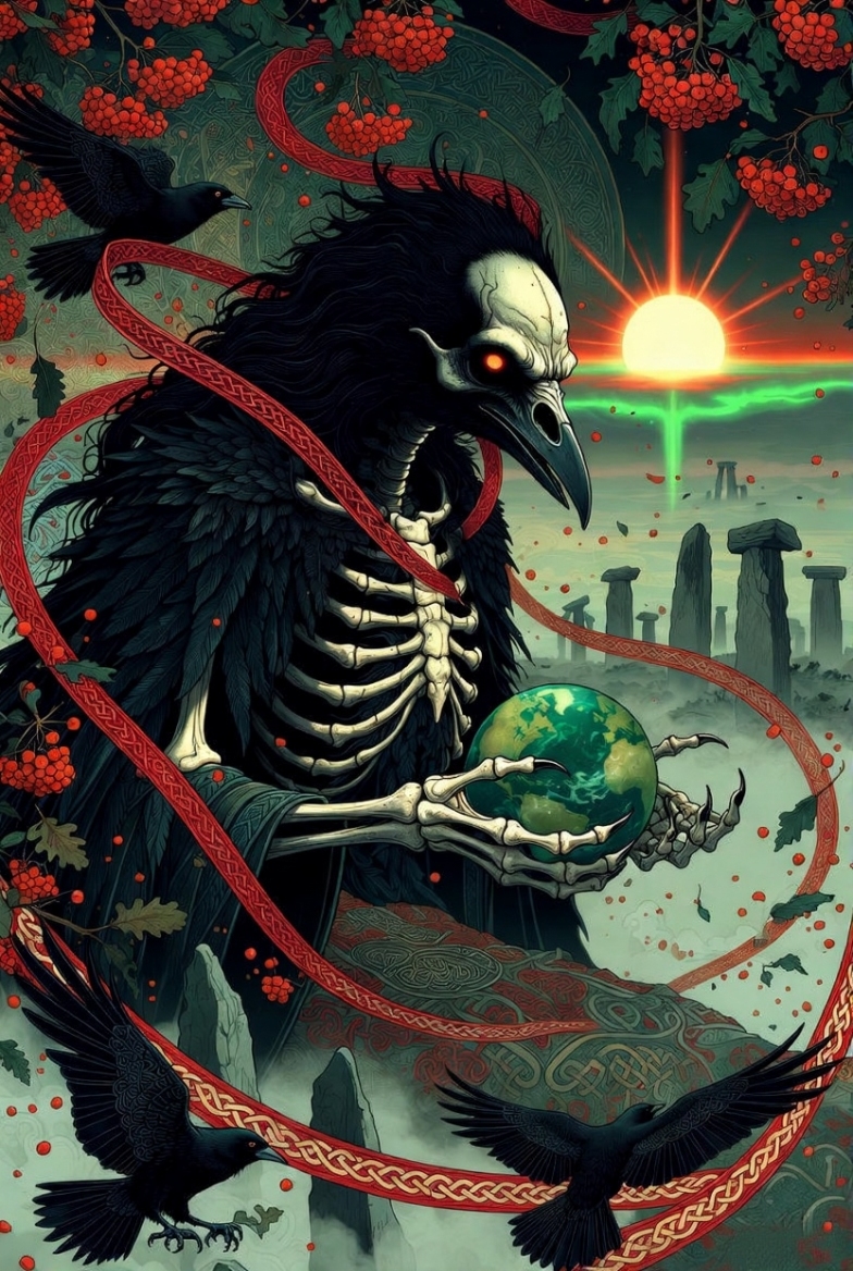 Her cloak, woven from crow feathers made of bone, scatters into swirling crimson Celtic knot ribbons carried by spectral winds. Ravens spiral around her massive silhouette, while rowan berries and oak leaves fall like blood-red omens through the fading light.