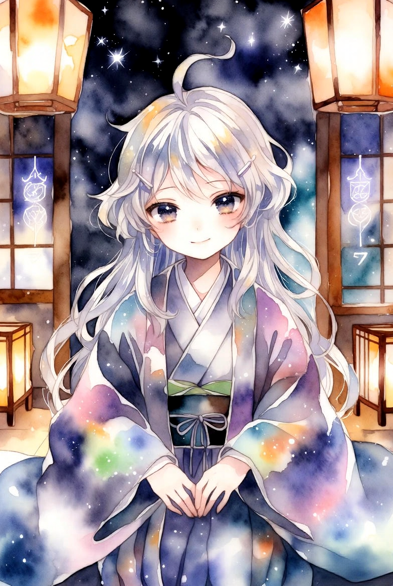 In this watercolor rendition, the Zashiki-warashi appears as a child dressed in traditional Japanese garments. Her face is soft and gentle, with large, curious eyes that reflect both the innocence of youth and the ancient wisdom of the spirit world. Around her, the room is subtly lit by an otherworldly glow, capturing the ethereal nature of her being.