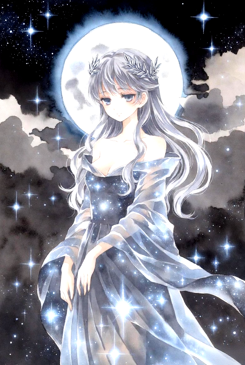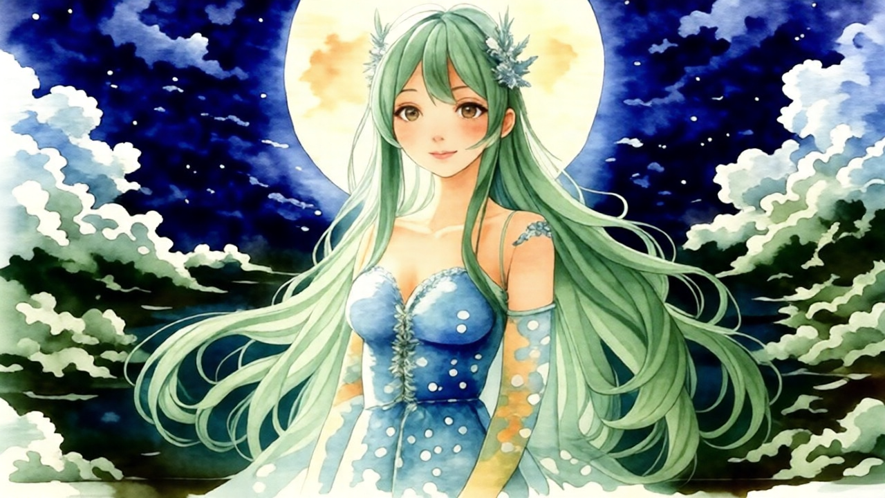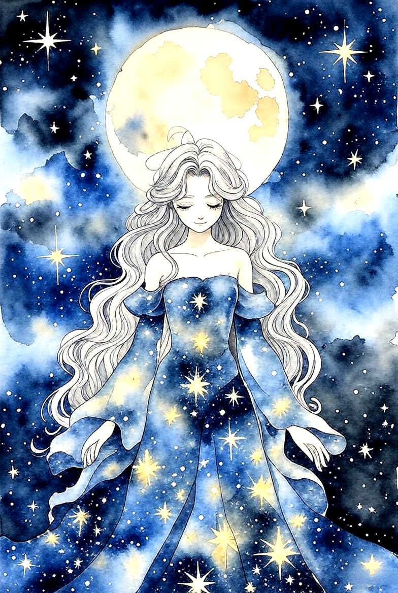 In this watercolor painting, Tsukigami appears as a graceful spirit, draped in a gown made of moonlight and shimmering stars. Her long hair, like a cascade of soft silver, flows around her as she stands beneath the full moon. Her expression is serene, with eyes that reflect the infinite beauty of the night sky. Around her, the atmosphere is alive with the glow of moonlight, casting a soft, celestial light on everything around her.