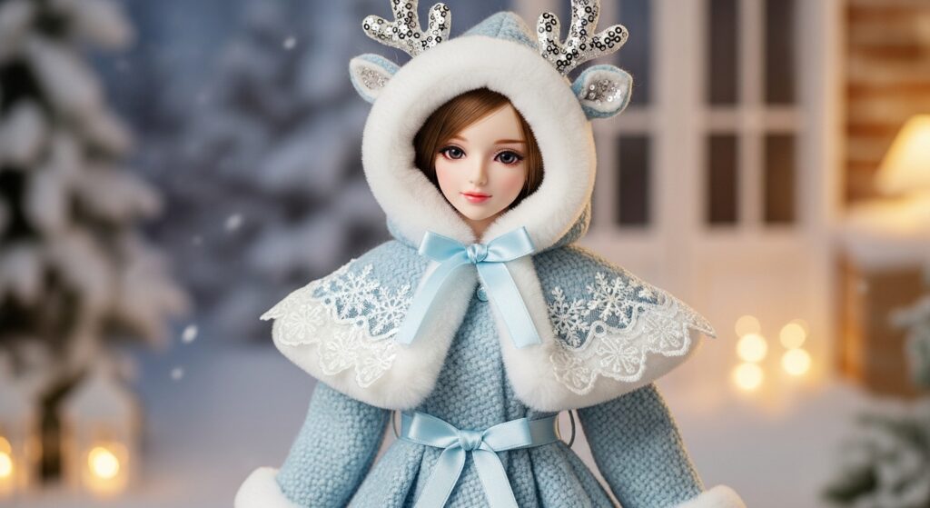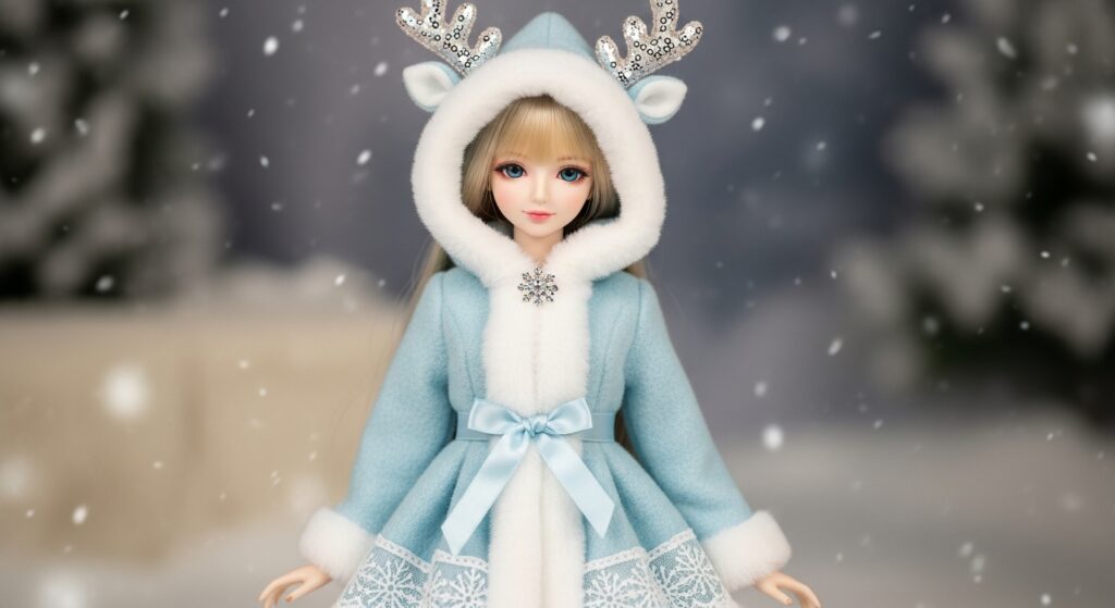 The Crystal Reindeer Coat combines fine craftsmanship with Christmas sparkle. Every detail—from the fur-trimmed hood to the shimmering lace hem—makes your doll look like a snow princess ready for winter celebrations.