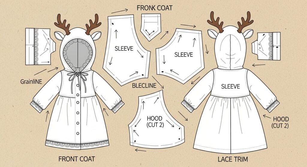 • 🦌 Reindeer hood: white felt antlers decorated with crystals or sequins.