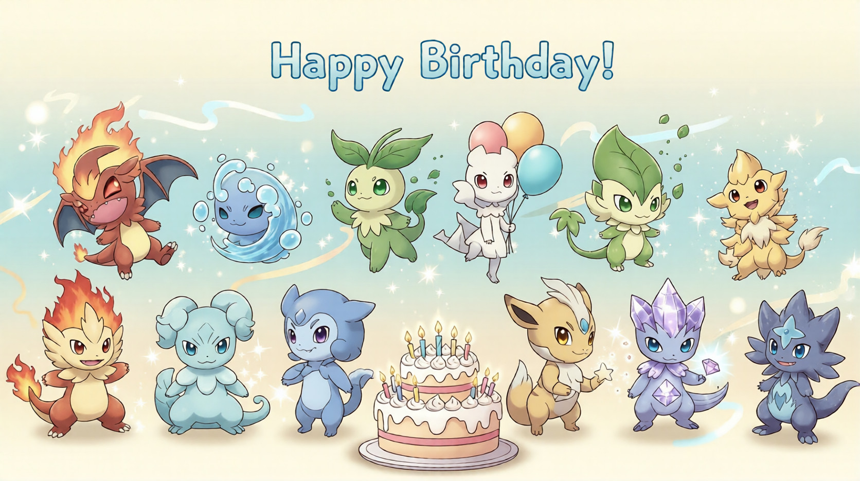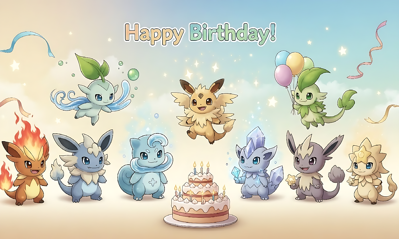 The Light Fantasy Japanese Anime Seven Creature Companions Birthday Banner is an original illustration inspired by the charm and adventure spirit of monster-companion fantasy worlds—while remaining fully original and copyright-safe.