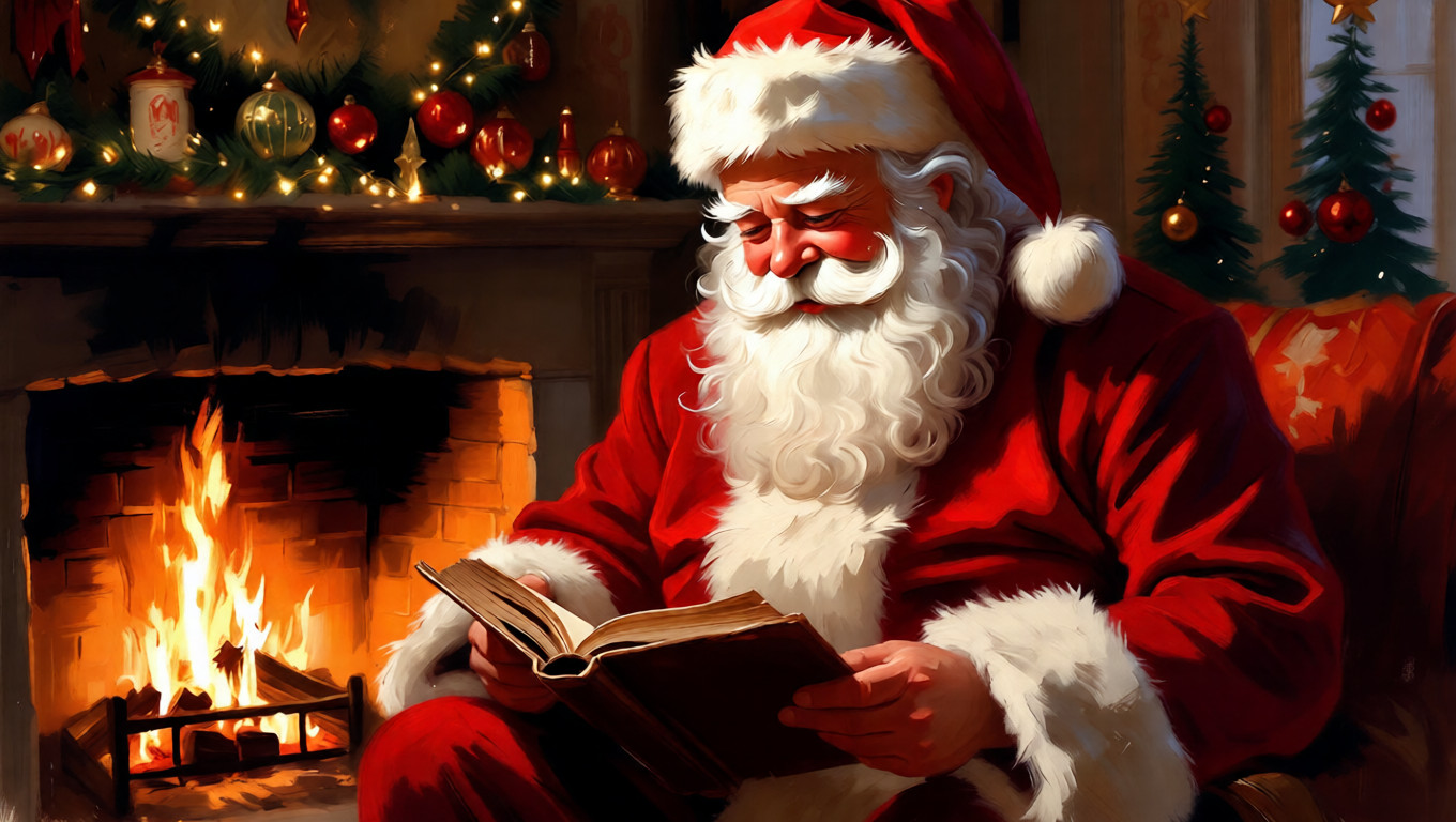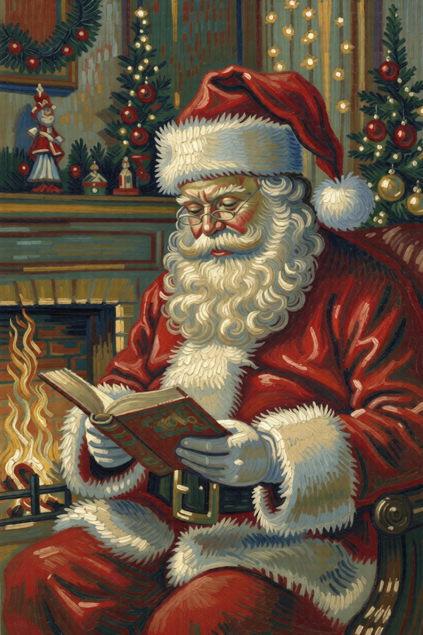 3 Comments on “Santa Claus Reading a Book – Cozy Christmas Oil Painting Poster for Holiday Décor
