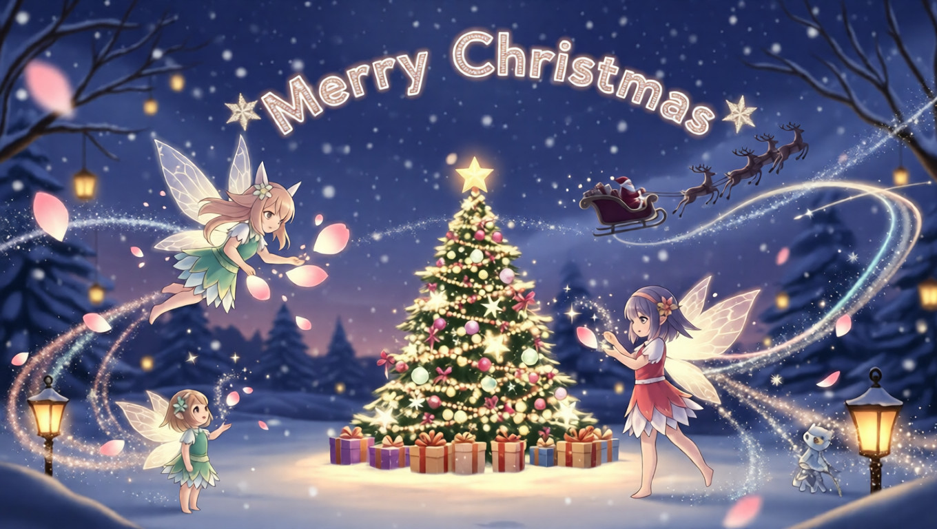 Petals of light drift through the air, bells chime softly, and the Christmas tree glows brighter with every wish. Santa’s sleigh glides across the sky, guided by shimmering trails of fairy dust, while reindeer leap effortlessly through the starlight.