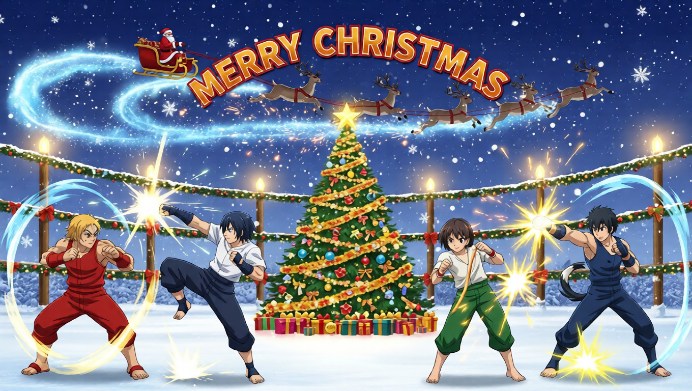 Fighting creatures gather to test their strength, not to compete, but to celebrate teamwork, courage, and joy. With every punch, kick, and stance, the Christmas lights shine brighter. Santa’s sleigh races across the sky, cheering them on as snow and energy collide in a burst of festive power.