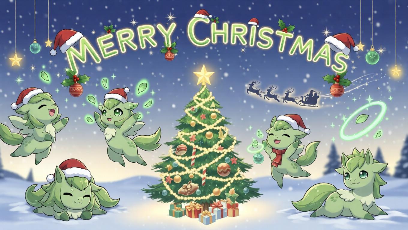 I built this banner around a tiny, gentle winter story that feels relatable and warm, not over-the-top. On a quiet, snow-filled Christmas night, the hidden grass psychic spirits wake up from their forest slumber to gather around the glowing Christmas tree, sharing their gentle natural warmth to keep the holiday space cozy.