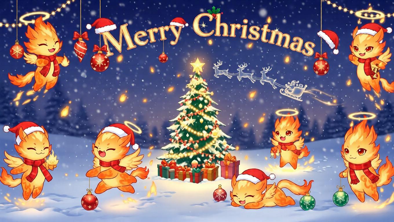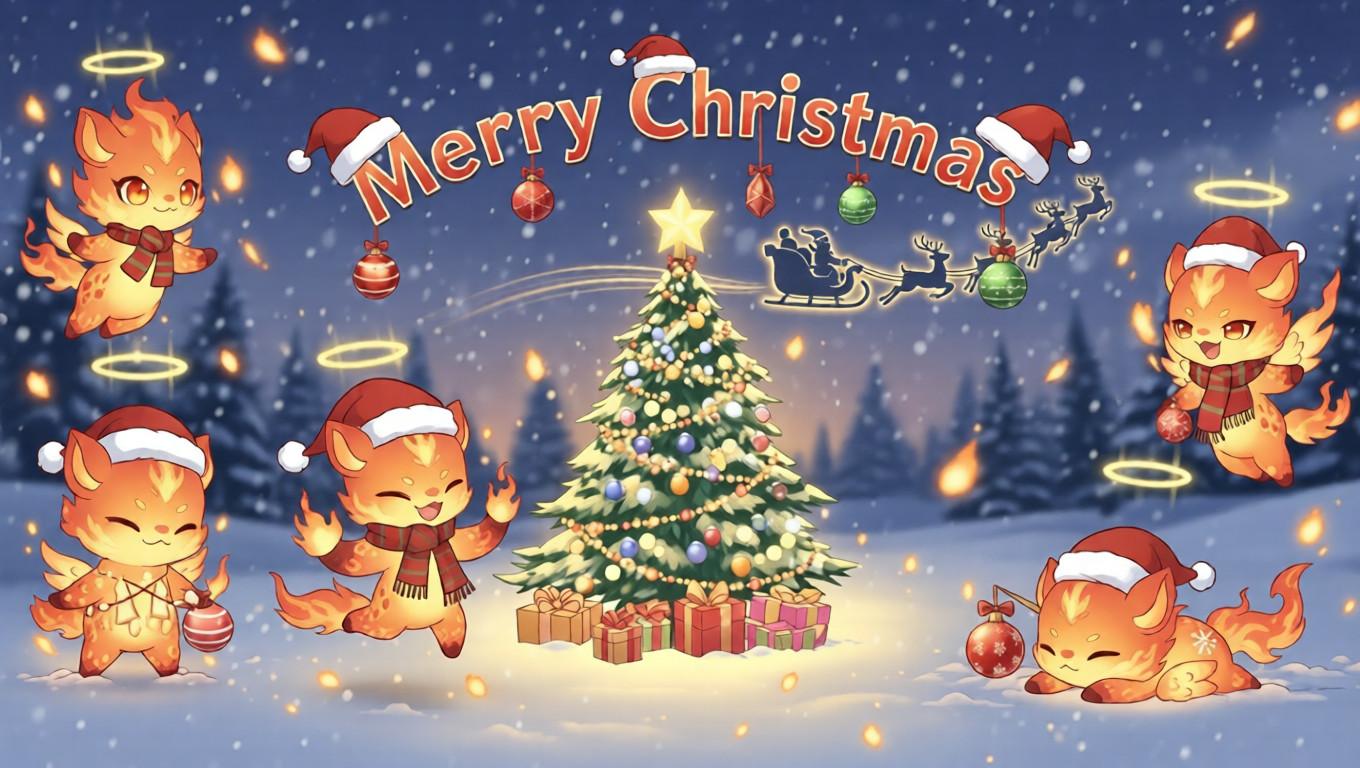 On a snowy Christmas night, fire-type fantasy spirits gather to keep the winter cold at bay. Their gentle flames light the forest as Santa’s sleigh glides overhead, filling the air with warmth and celebration.