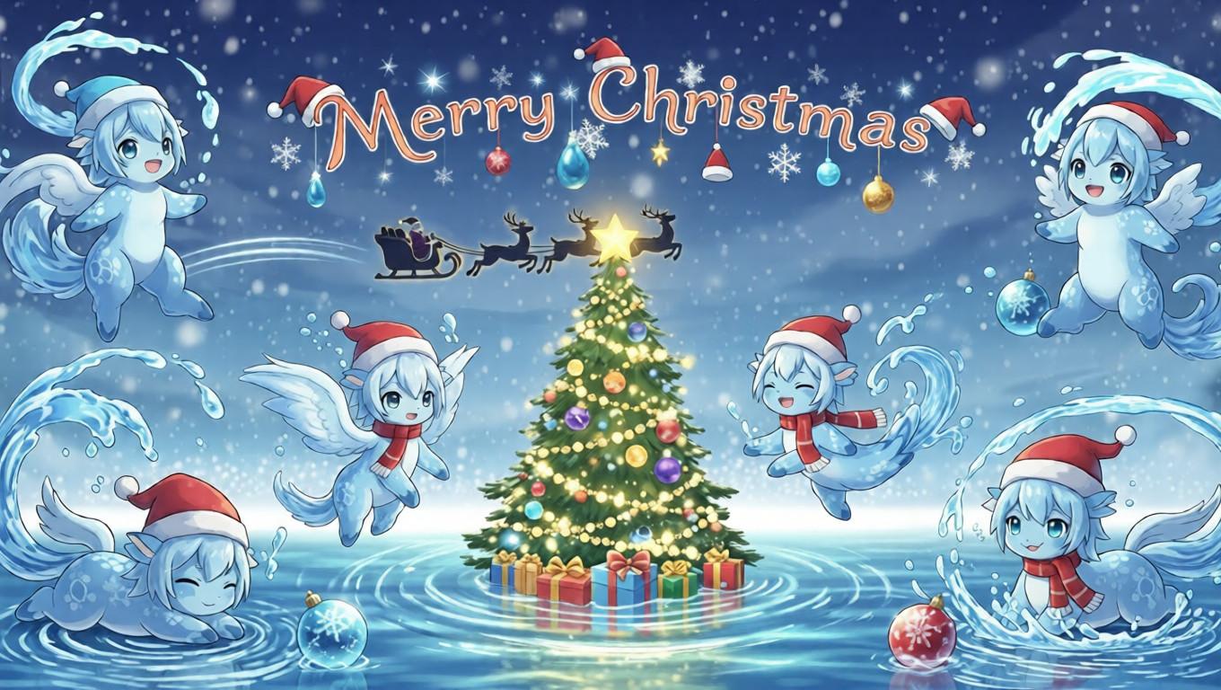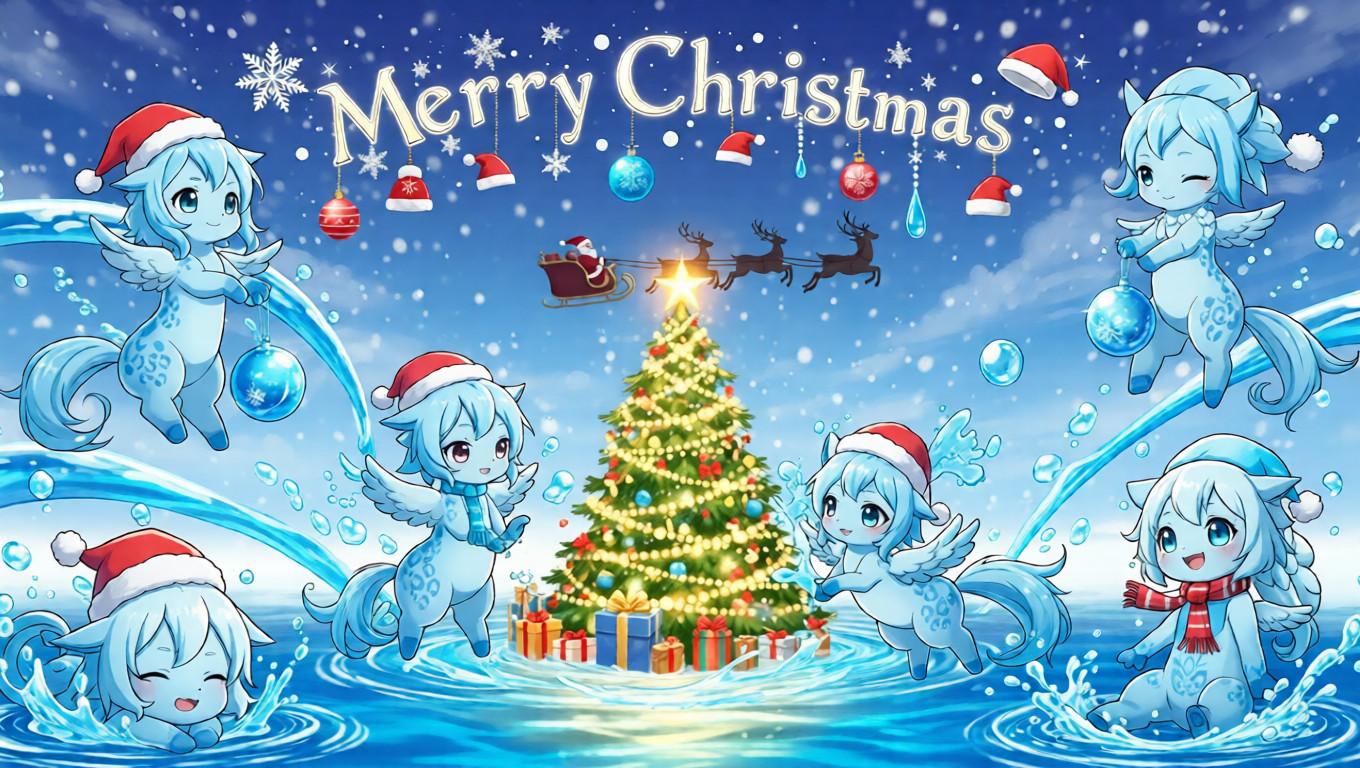 As snow falls softly, water-type fantasy spirits gather around the Christmas tree. Their glowing reflections ripple across the ground while Santa’s sleigh passes overhead, turning a quiet winter night into a moment of shared wonder.