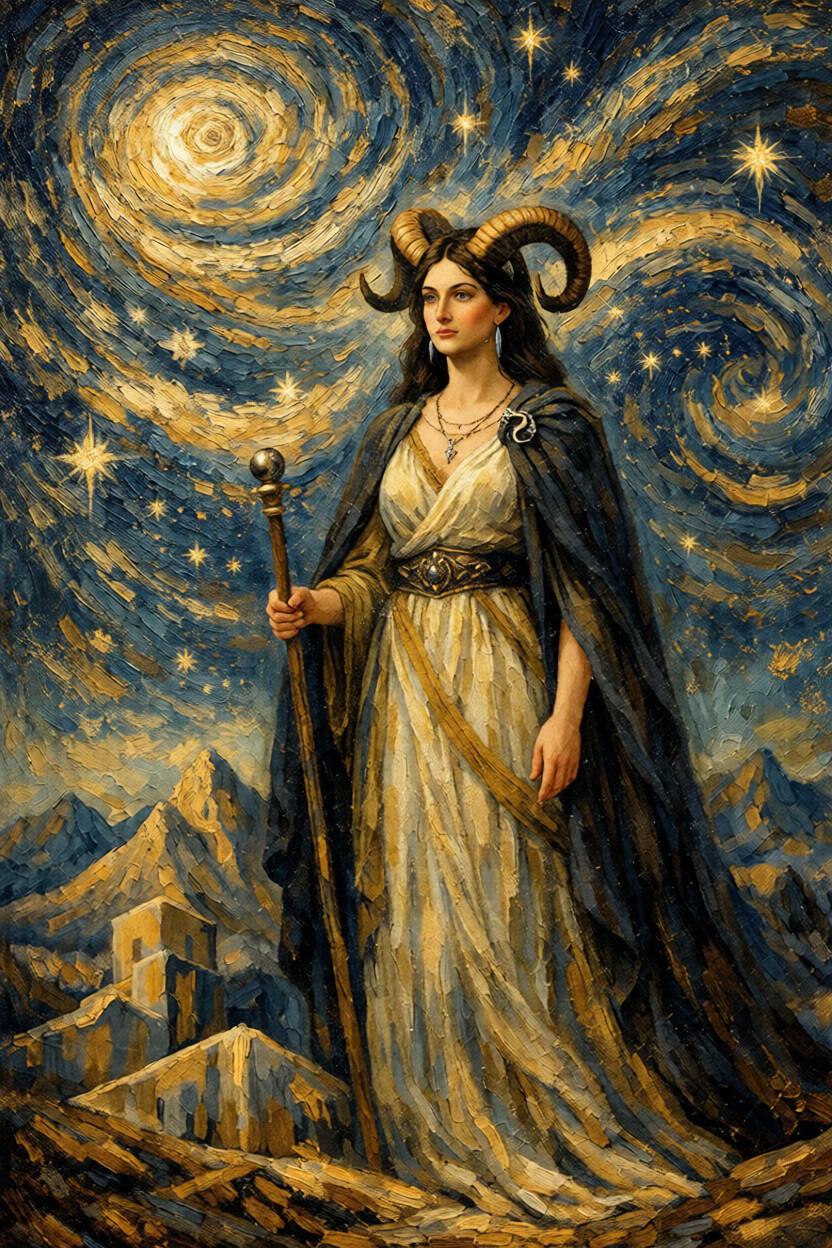 In this painting, Capricorn appears as a composed female figure beneath a vast, swirling night sky. The stars above her move with subtle intensity, echoing the passage of time and the unseen forces that guide ambition. Beneath her feet, the land rises in structured forms, mountains and lines suggesting discipline, responsibility, and the weight of long-term vision.