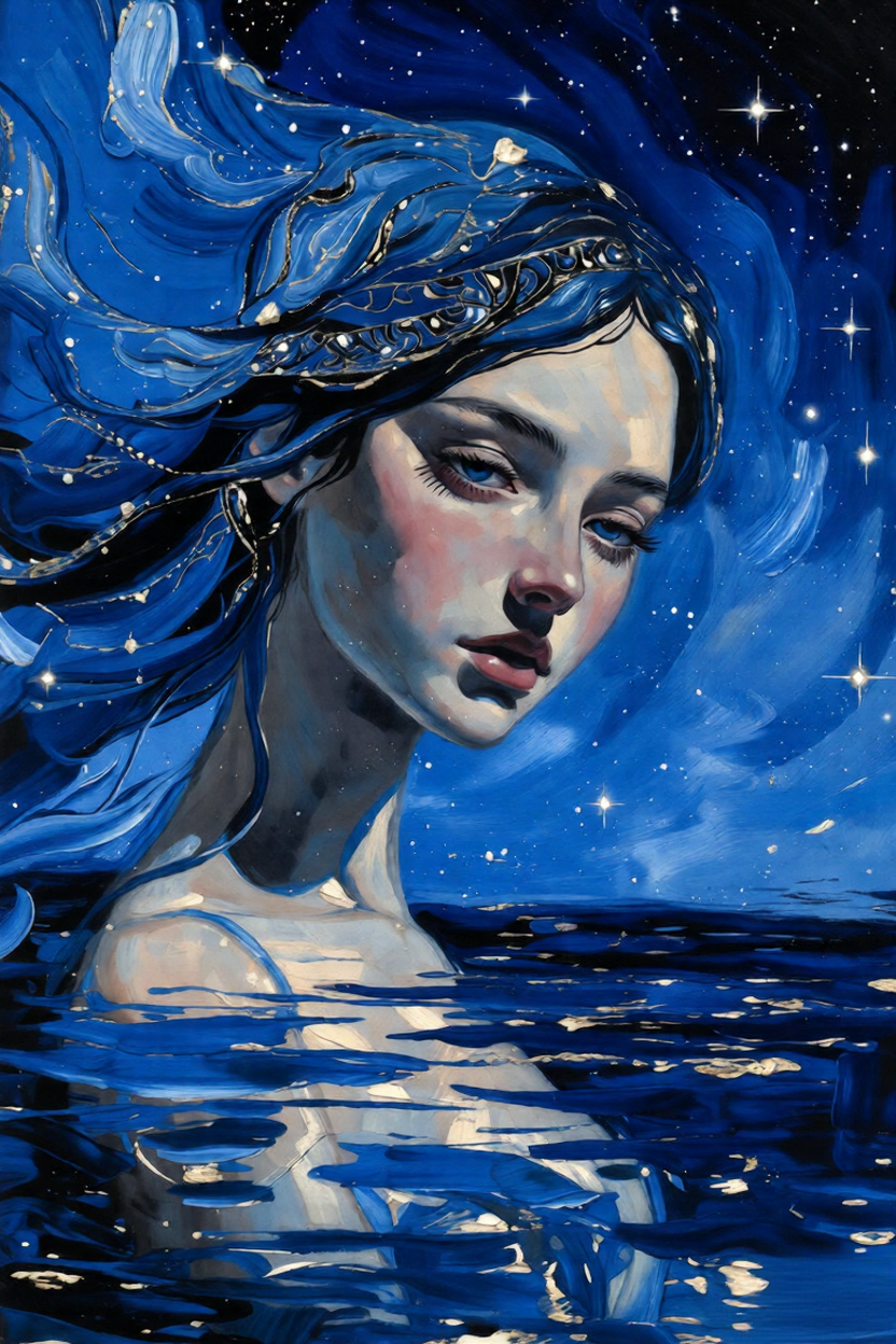 I started painting late, well past when I should’ve stopped. Blues first. Deep ones. Then darker layers. Then light—scattered, star-like, almost festive. Not cheerful exactly. More like distant celebration light reflecting off water at night.