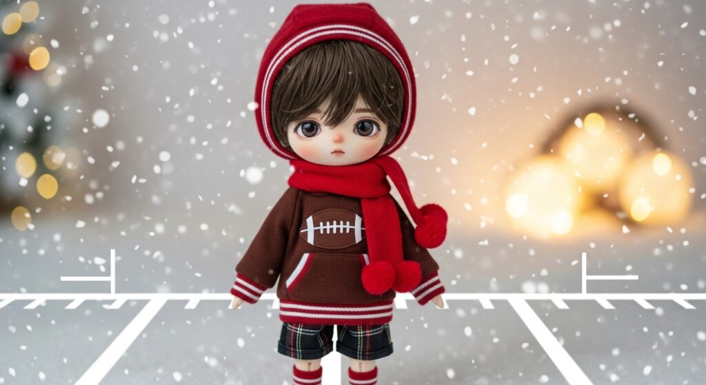 The Touchdown Christmas Boy outfit blends cozy Christmas vibes with sporty energy, creating an adorable handmade fashion for your chibi-style dolls.