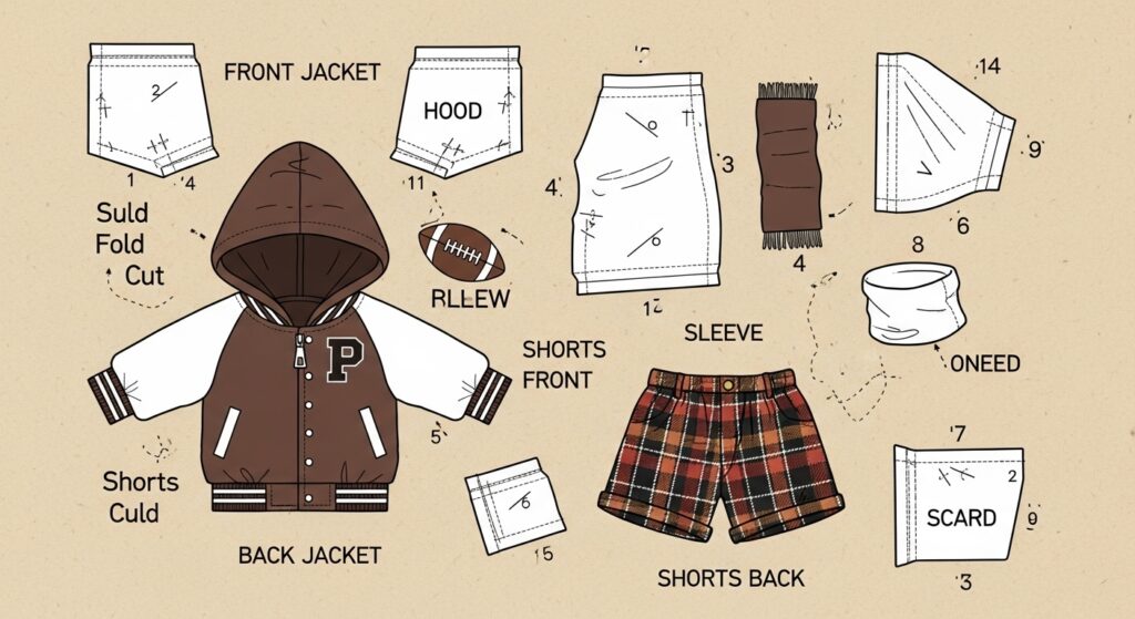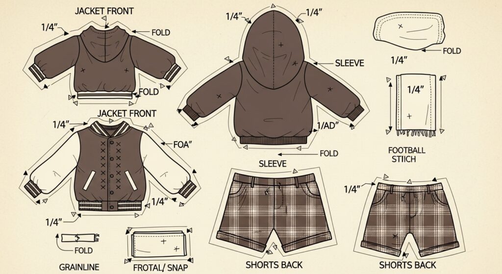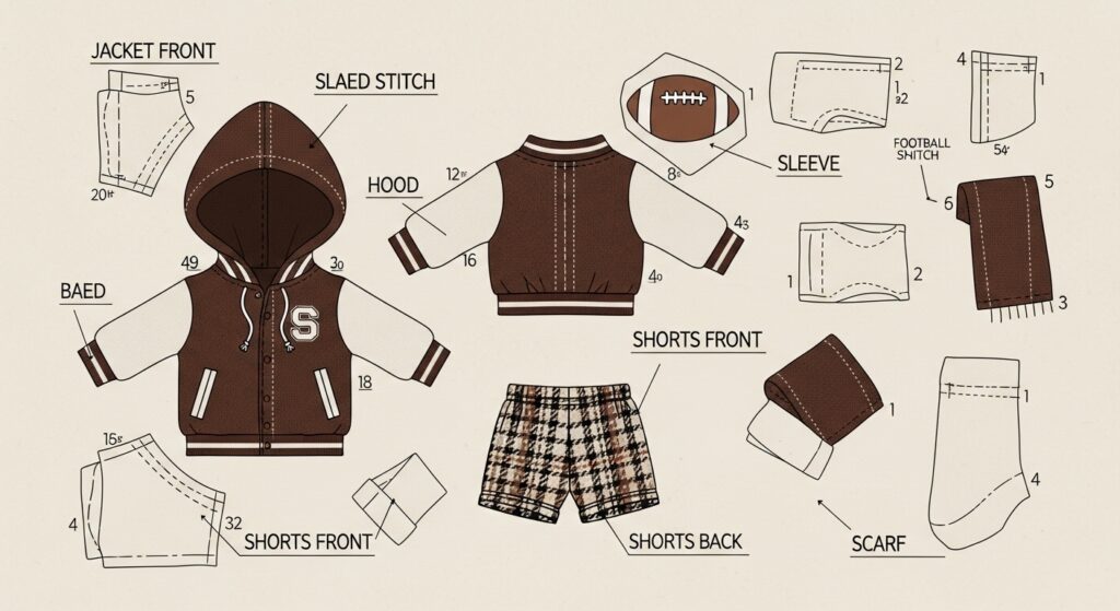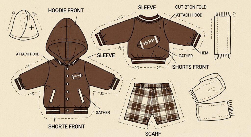 This free printable sewing pattern includes a varsity-style hoodie, plaid shorts, and a cute mini scarf. With accurate measurements and seam guidelines, even beginners can craft this look with ease.