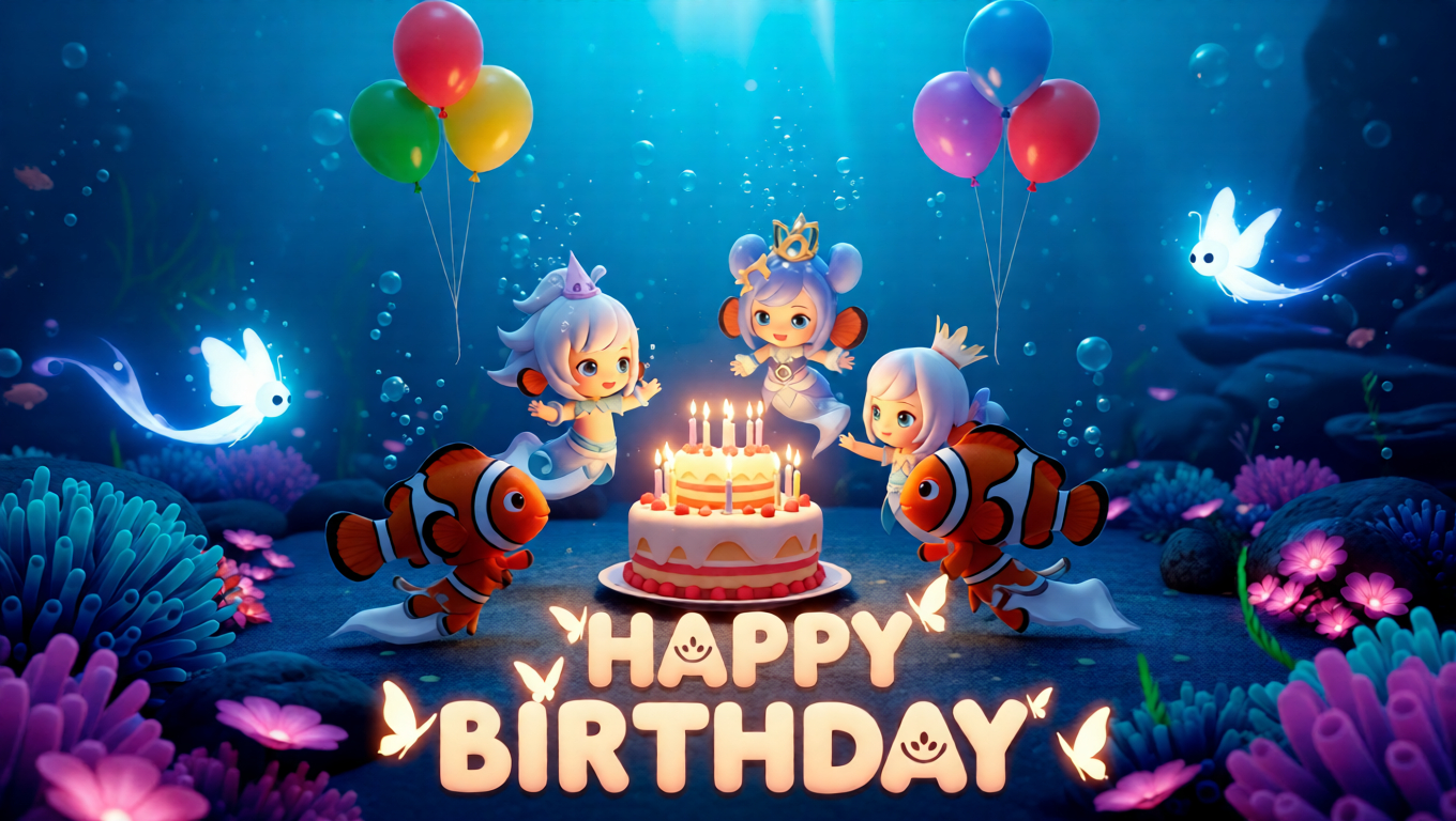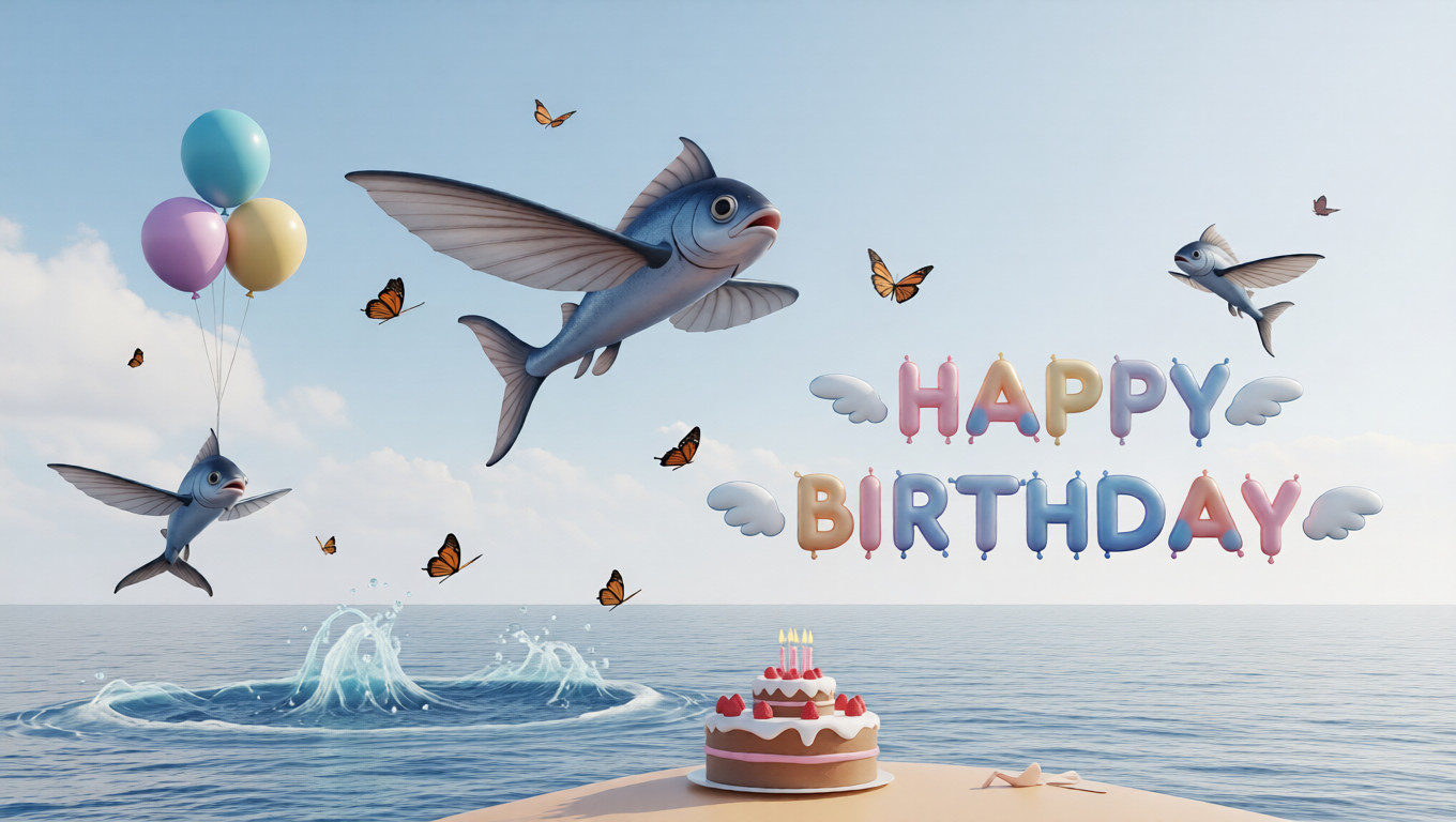 Several flying fish spirits appear at different heights, each with its own personality. Some glide close to the cake, others soar higher with the butterflies. The whole scene feels like a paused breath—a moment where laughter hasn’t happened yet, but you know it’s about to.