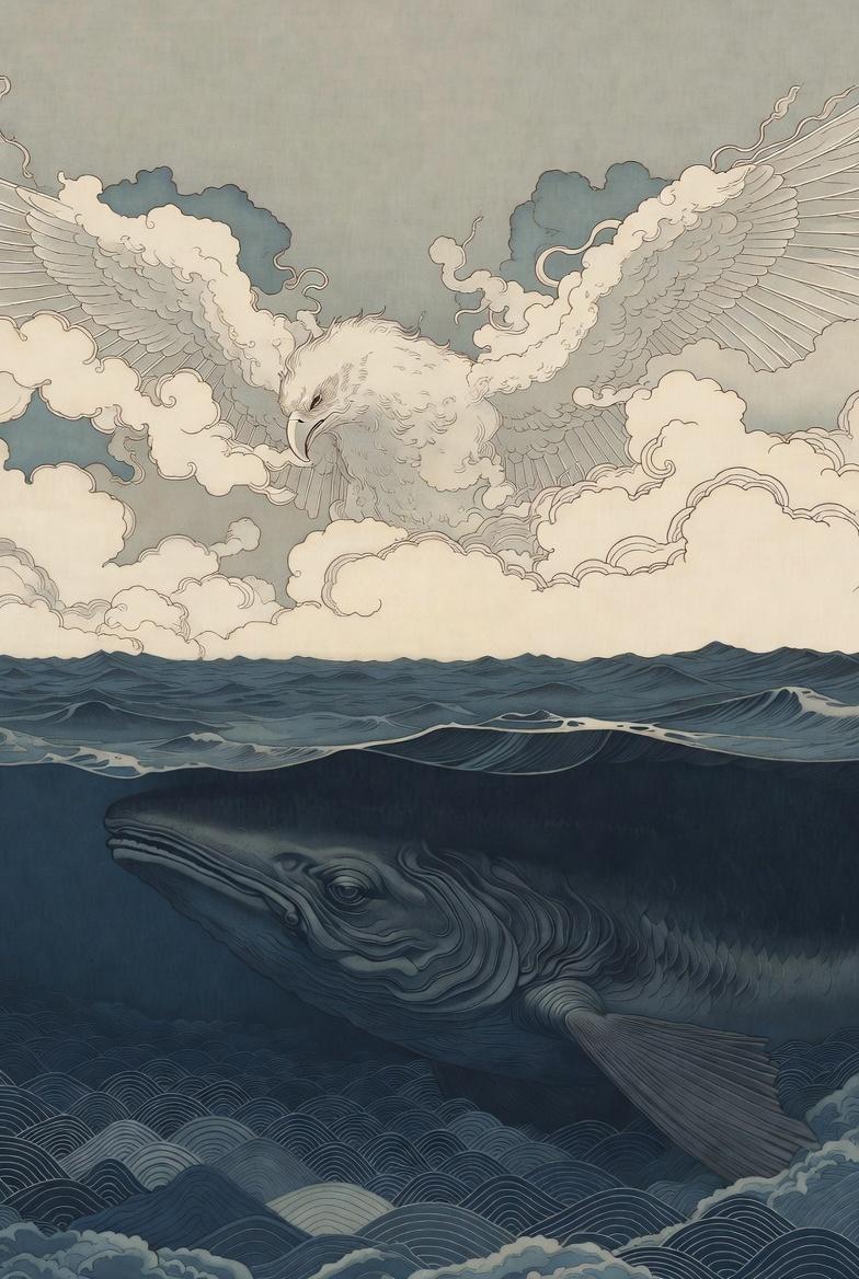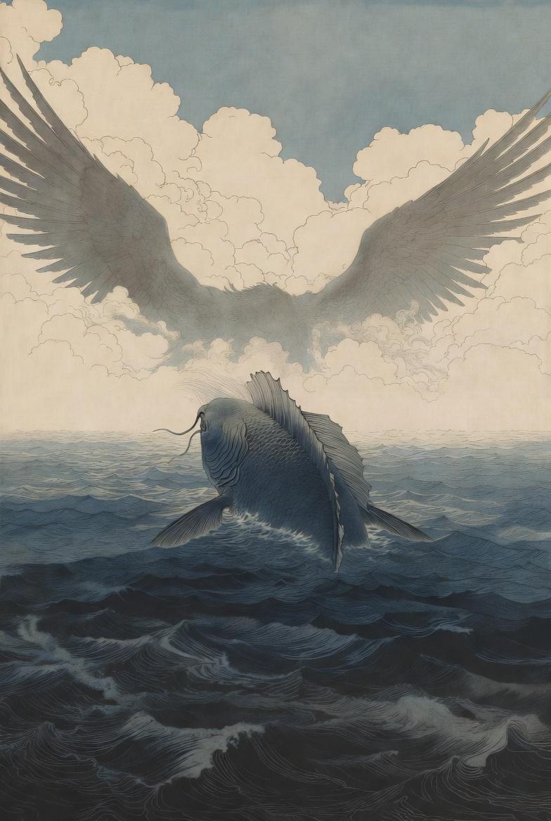 Visually, I wanted to avoid dramatization. No explosive metamorphosis. No lightning. No cinematic shock. Instead, the transformation is implied through composition: water dissolving into sky, scales becoming feathers, depth shifting into altitude.