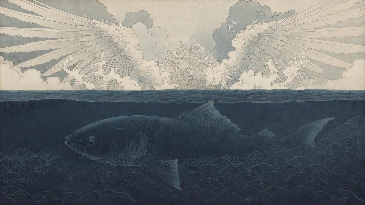 The idea of Kun—this unimaginable fish existing in deep water—felt like the emotional state of many people before transformation. Vast inner worlds, invisible to others, dismissed because they have not yet taken flight. Kun does not perform. It waits.
