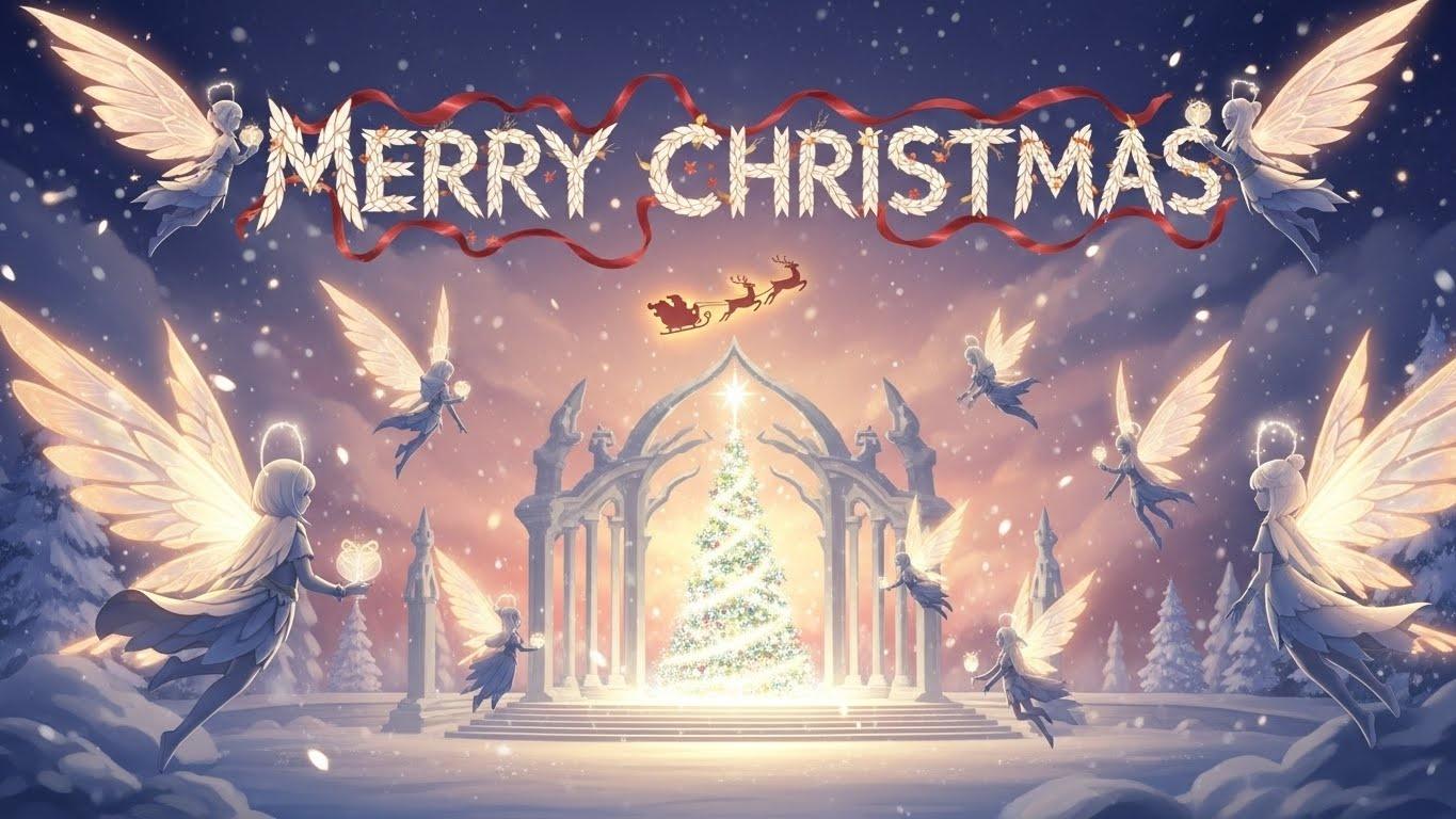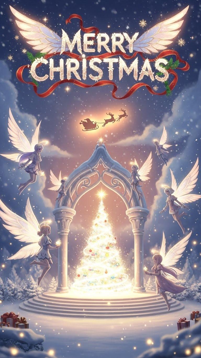 Living room: Mark sat on the sofa. He looked at the banner’s sanctuary blessing composition. At the center, a Christmas tree made of layered light and frost‑kissed leaves rose without sharp edges. Santa and his reindeer appeared as small, warm figures in the background – not dominant, just present. The words “Merry Christmas” were not pasted on top. They were built from ribbon‑like curves and fairy light particles, integrated into the sky as if the air itself had formed the letters.