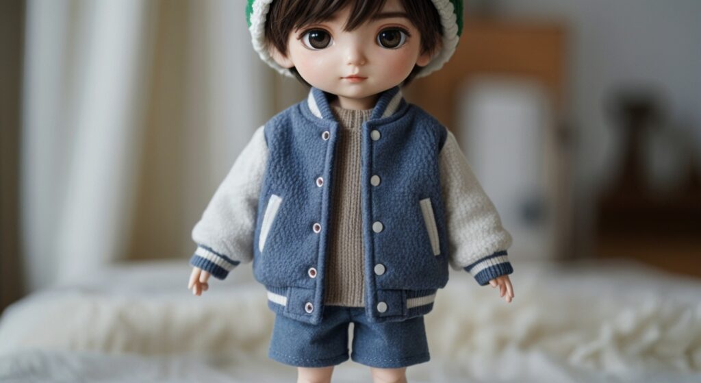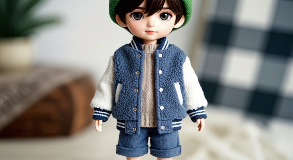 Designed exclusively for 18–20cm chibi-style boy dolls, this handcrafted pattern features a short fleece varsity jacket, a soft knit sweater, wool shorts, and a beanie.