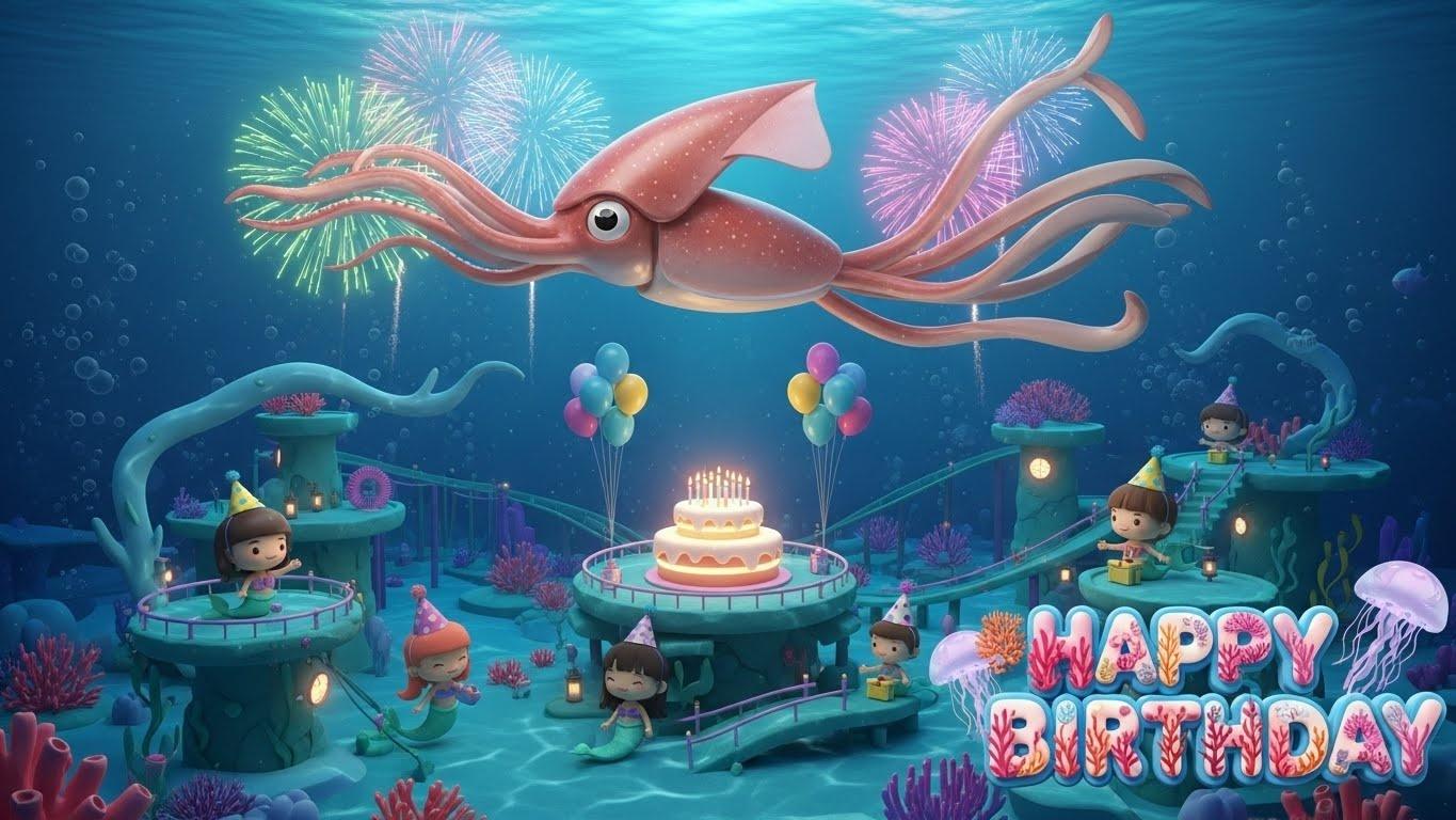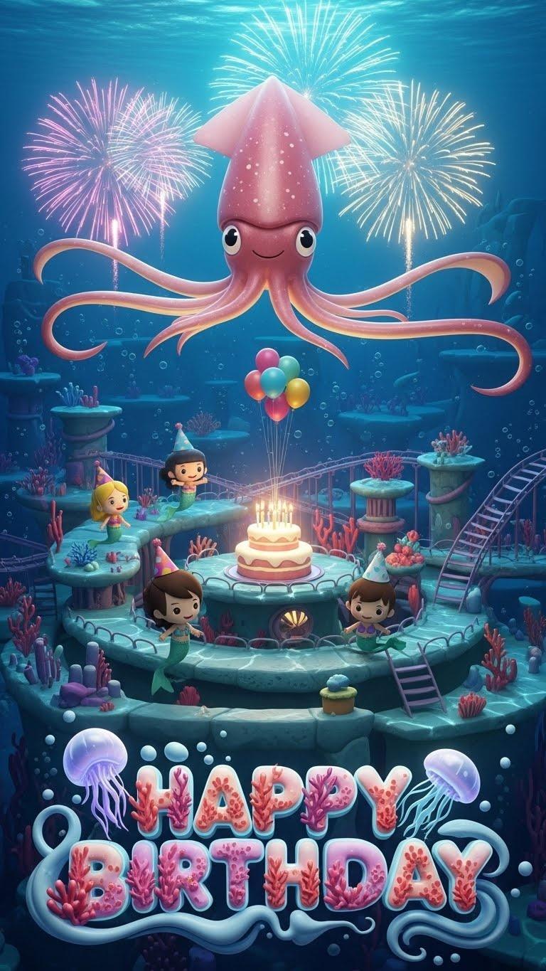 The “Happy Birthday” text is designed as a custom underwater carnival font. Each letter has a rounded 3D form, with soft coral textures and glowing edges inspired by jellyfish light. The letter tails stretch slightly, echoing the long fins of the bigfin squid, while small bubble and spark motifs are embedded inside the strokes. The text appears to float naturally within the water, gently illuminated by nearby fireworks, making it feel like part of the scene rather than an overlay.