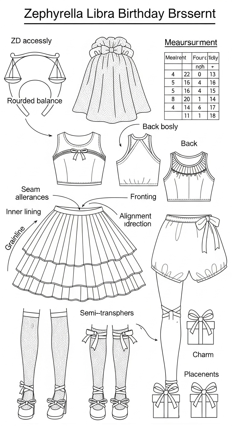 The layered skirt is cut in soft, geometric pleats, embroidered with delicate gift charms and abstract scale motifs—subtle reminders of Libra’s fairness, attention to social detail, and thoughtful gifting. The inner lining ensures structure without heaviness, allowing the skirt to maintain its airy silhouette while preserving chibi proportions.