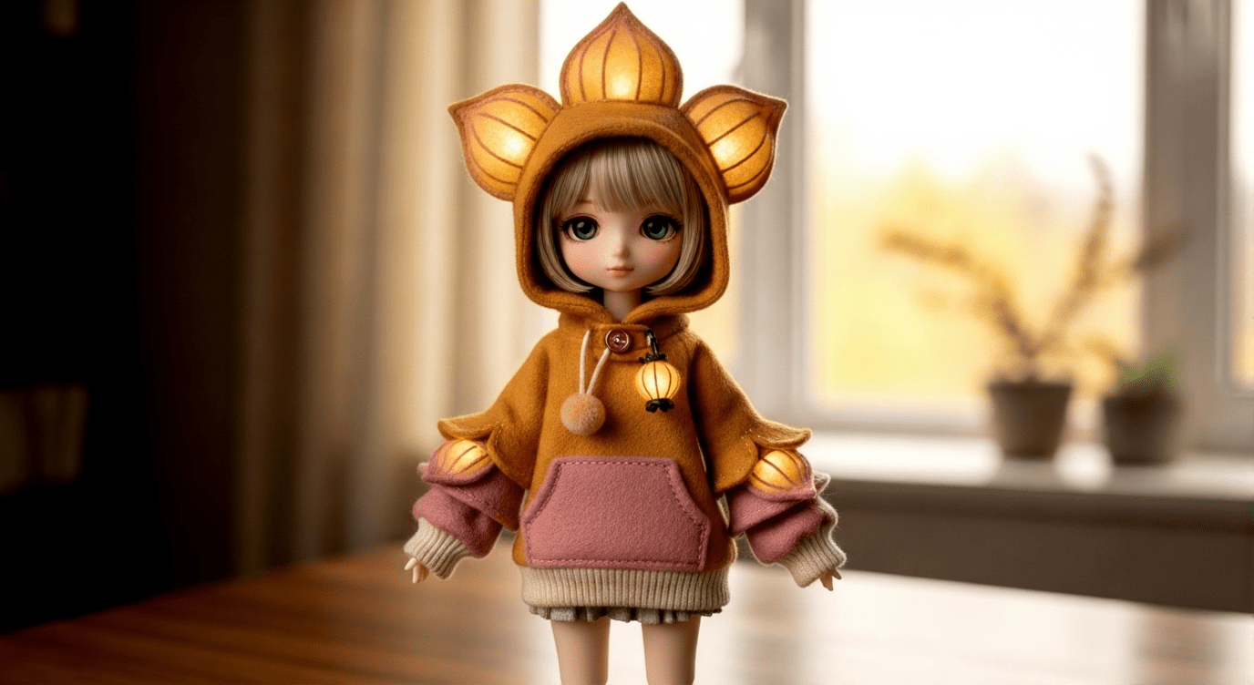 Bring a warm seasonal touch to your 30cm Q-style doll with this original Autumn Lantern Hoodie Pattern, designed specifically for crafters who love clean aesthetics and relaxed fall colors. This outfit avoids all copyrighted motifs and instead uses a unique lantern-petal hood, soft layered trims, and a detachable tiny fabric lantern accent—perfect for doll collectors who enjoy modern, cozy, Western-style fashion.