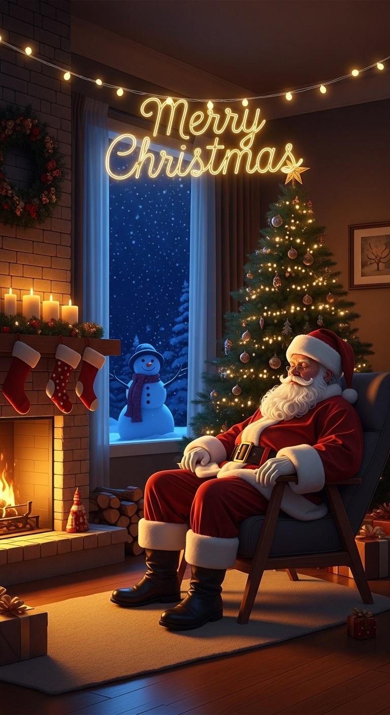 The warm living room surrounds him: fire glowing gently, stockings hanging at varying heights, gifts placed casually rather than stacked. Outside the window, a snowman stands quietly in falling snow, providing a cool-toned contrast that deepens the image without pulling attention away from the interior.