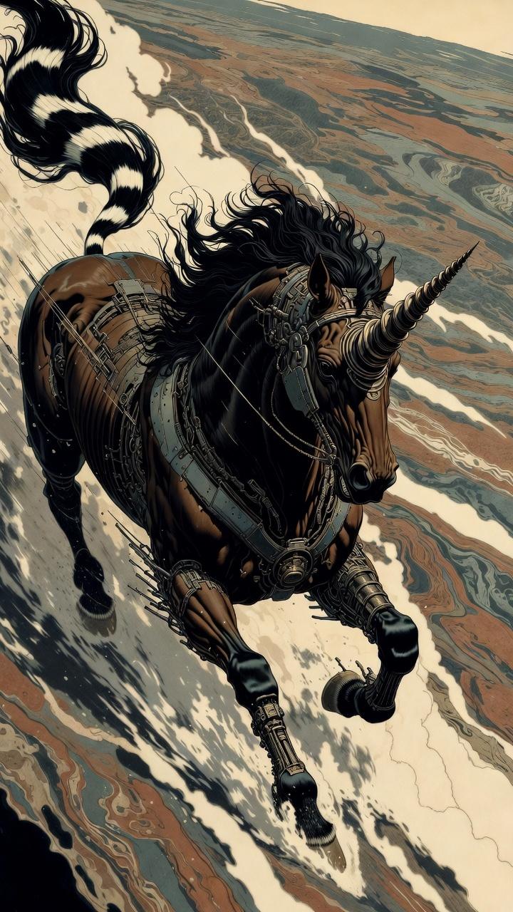 Loss of control at high speed. Systems moving faster than ethics. Bodies pushed beyond natural limits. So instead of claws dripping with menace, I gave the Bo-horse mechanical precision. Instead of a wild horn, a spiraled drill—beautiful, terrifying, purposeful.