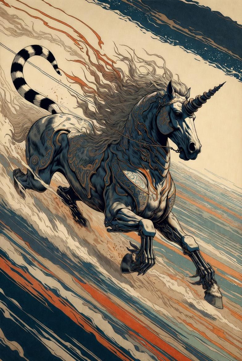 Composition mattered a lot. I borrowed structural balance from ukiyo-e prints—low horizons, strong directional flow—but replaced waves with dust trails, energy fields, and abstract plains. The creature cuts across the frame, never centered, always moving.
