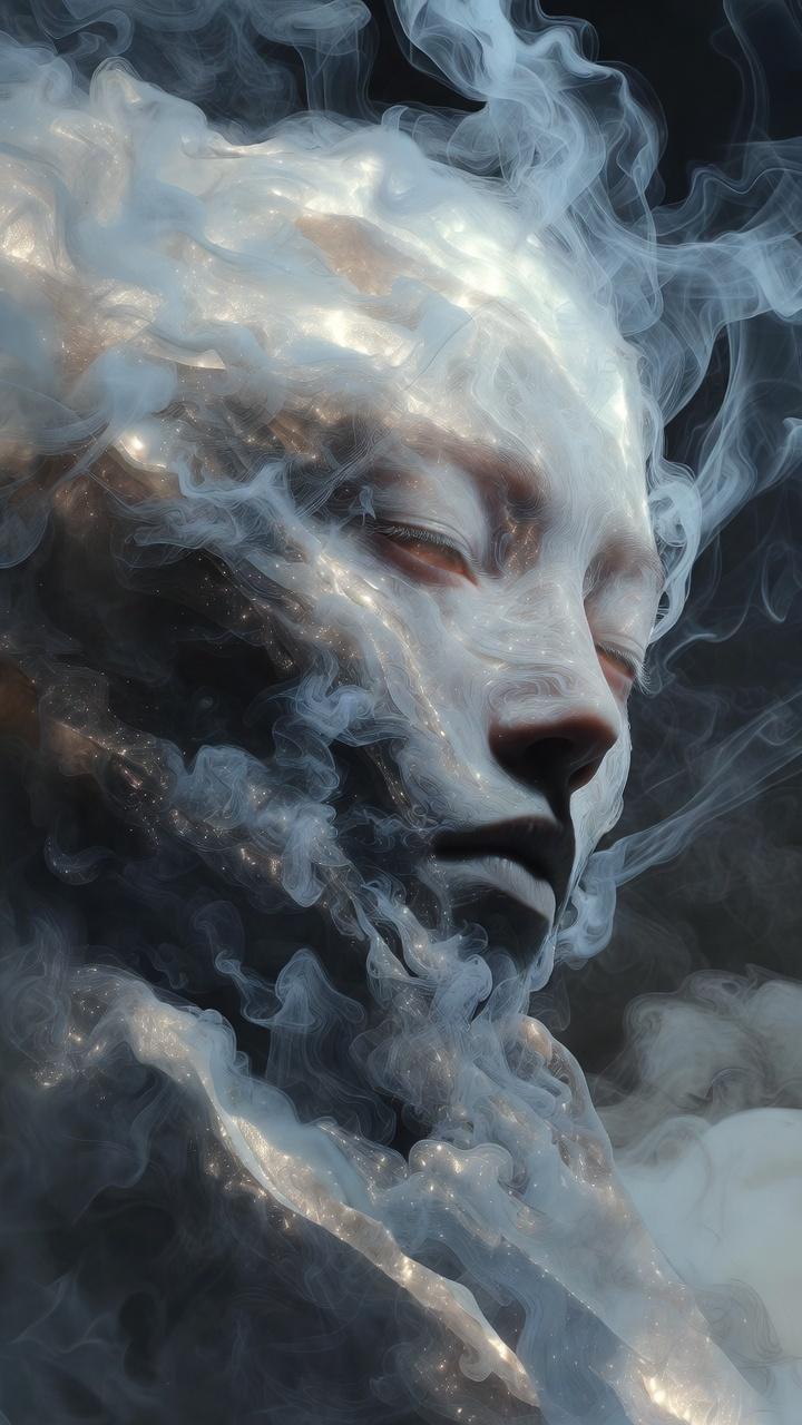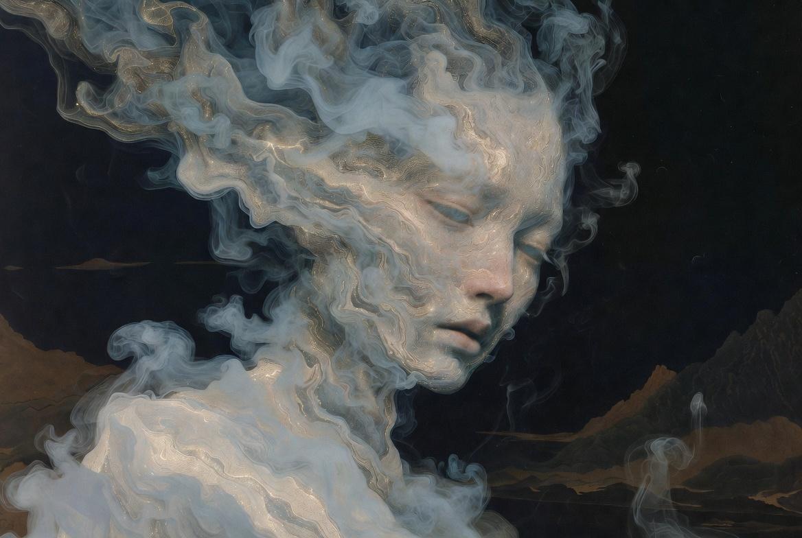 For a moment, it gathers into something almost recognizable. A suggestion of eyes. A curve that could be a mouth. Then the wind shifts.