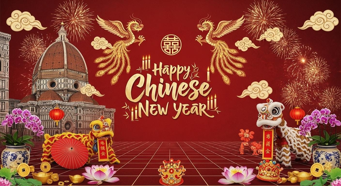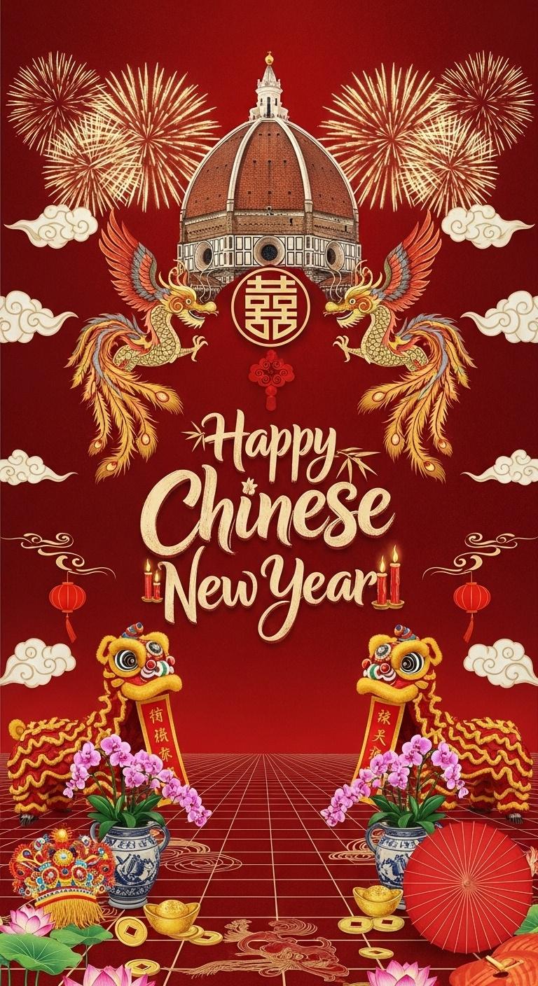 I step into the scene as if I am the bride walking toward my own future. Behind me rises a monumental photo backdrop where Chinese New Year fireworks bloom across a Renaissance sky, echoing the silhouette of Florence’s cathedral dome. The gold-and-vermilion palette glows like candlelight reflected on silk. At the center, the Double Happiness emblem is reimagined in a sculptural English lettering: “Happy Chinese New Year” flows in a custom font shaped by cloud scrolls and bamboo joints, with subtle phoenix feather terminals and dragon-tail ligatures. It feels celebratory yet museum-worthy.