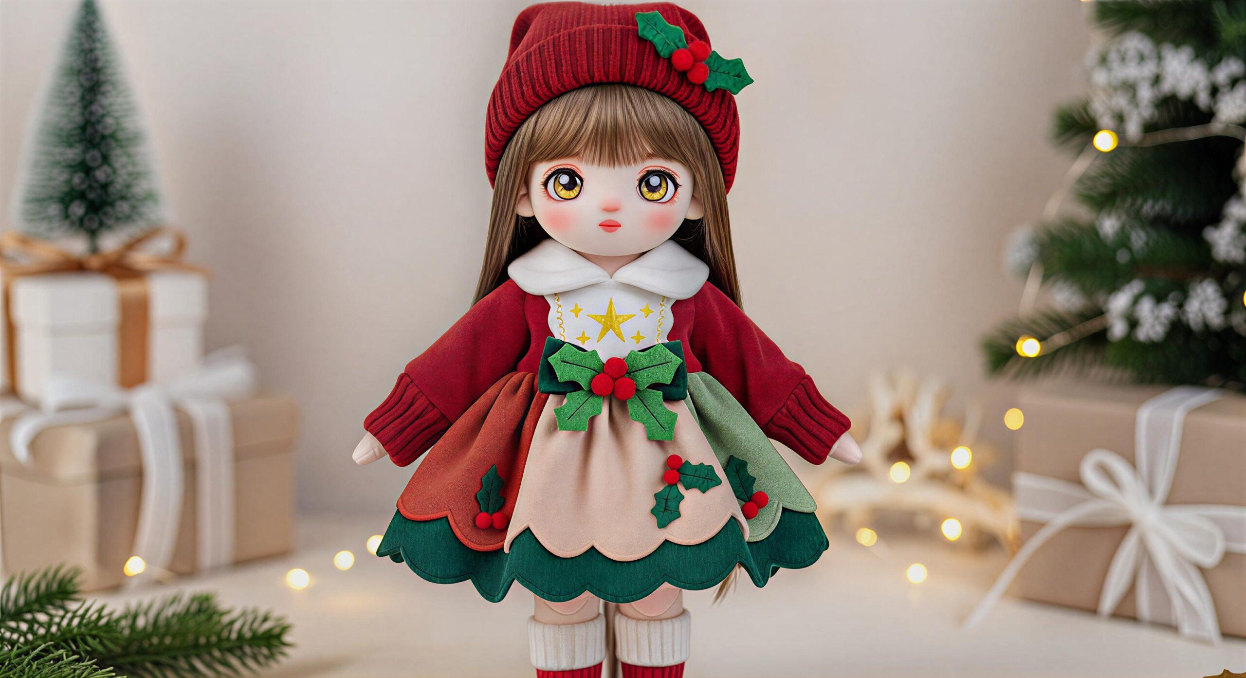 Celebrate the warmth and magic of the holiday season with the Holly-Star Twinkle Dress, a fully original Christmas-themed outfit designed for 3D plush-style girl dolls.