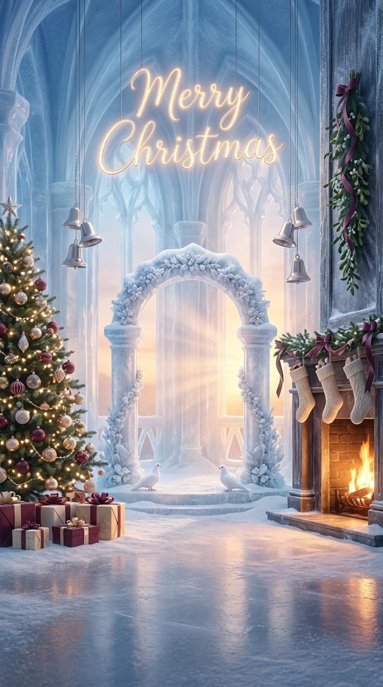 This Winter Sunset Ice-Palace Christmas wedding backdrop is a fully immersive photographic environment designed for modern luxury ceremonies and studio productions. By combining burgundy winter styling, architectural snow elements, warm fireplace lighting, and symbolic white doves, the scene delivers both emotional storytelling and technical usability.