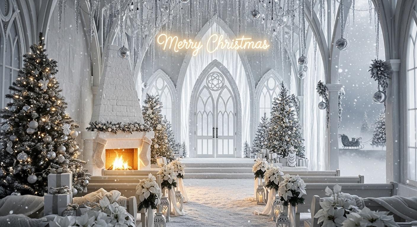 The White Wonderland Christmas wedding backdrop is one of the most sought-after winter ceremony trends for 2026, combining immersive seasonal storytelling with functional photography design. Built around a snow-covered chapel concept and an ice-palace architectural environment, this backdrop transforms any venue or studio into a cinematic winter wedding stage. It is especially suited for couples planning a Christmas wedding, photographers preparing seasonal portrait sessions, and event stylists looking for a cohesive holiday ceremony focal wall.