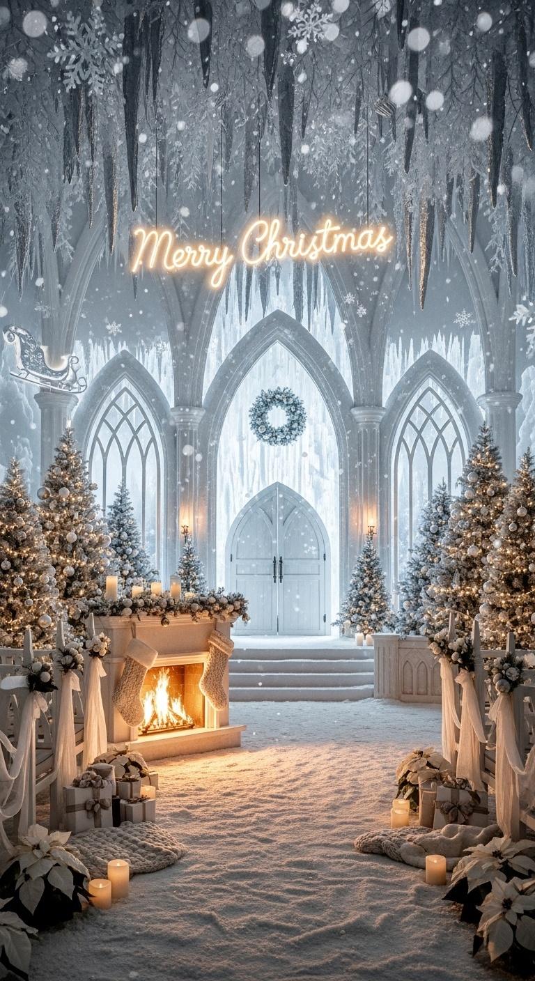 The visual language is intentionally layered. Fir trees with warm micro-lights create natural depth for portraits, while silver icicles and snowflake confetti elements introduce movement and sparkle without overwhelming the frame. The fireplace provides a warm tonal anchor, balancing the cool white environment and ensuring flattering skin tones in real shooting conditions. Poinsettia arrangements add a classic Christmas wedding accent while maintaining a refined luxury palette.