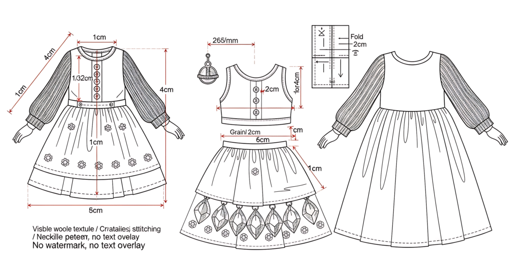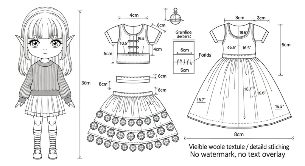 Designed for 28–30 cm elf dolls, the pattern includes detailed measurements, seam guides, and clear construction notes that make it easy for both beginners and experienced doll outfit makers.