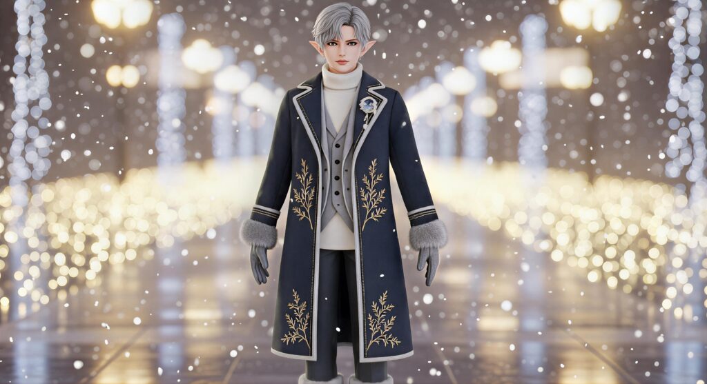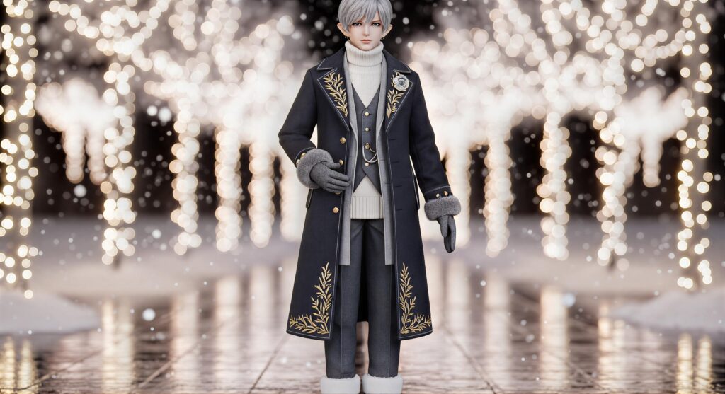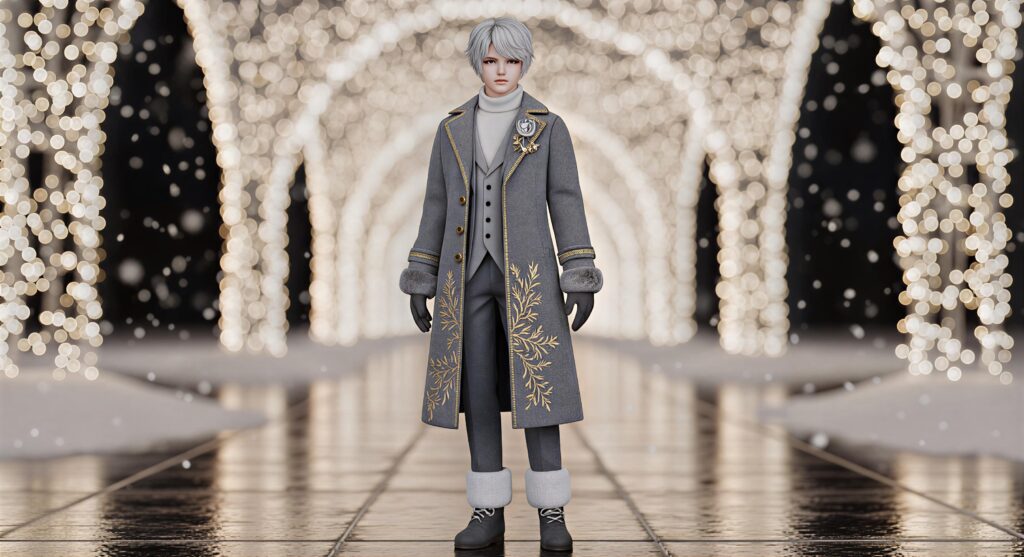 Inspired by Japan’s soft white-and-gold illumination displays, this original Christmas outfit blends elegant menswear tailoring with festive holiday details—without using any copyrighted motifs.
